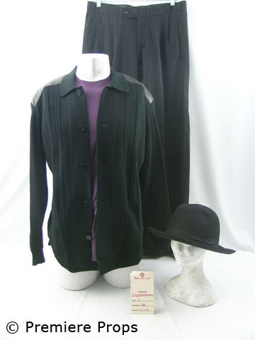 Floyd's (Bernie Mac) black cotton knit w/ black leather patches at shoulder / vertical self stripe design down each side of front "Torras" l/s button up cardigan (size 44), black w/ front pleat "Woody Wilson" slacks (made to order), purple silky cotton "Brioni" s/s crew neck t-shirt (size XL), black wool w/ black band "Borsalino" fedora (size 7.5) (includes wardrobe tag / screen worn)