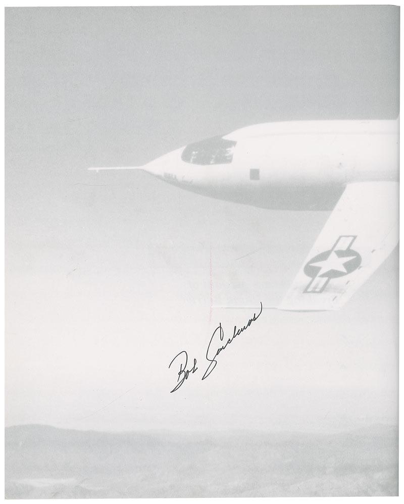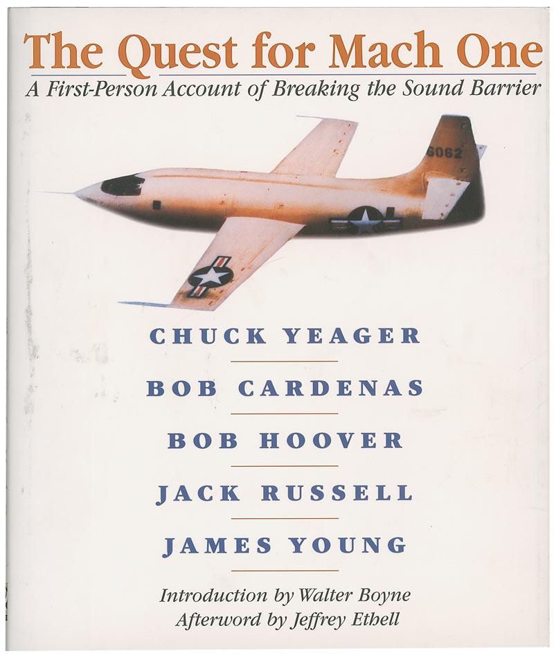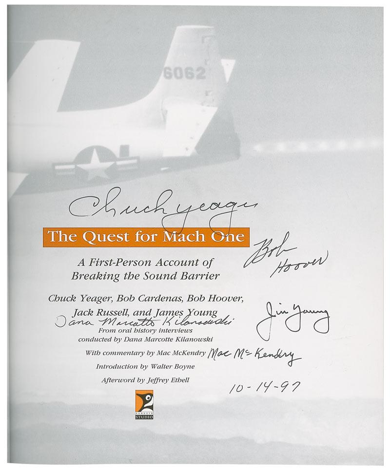 Signed book: The Quest for Mach One. First edition, first printing. NY: Penguin Books, 1997. Hardcover with dustjacket, 9.5 x 11.25, 142 pages. Signed in black felt tip on the title page by Chuck Yeager, Bob Hoover, Jim Young, Mac McKendry, and Dana Marcotte Kilanowski, and on the adjacent page by Bob Cardenas. In fine condition, with some scuffing and light soiling to the dustjacket. An impressive collection of top-notch test pilots.