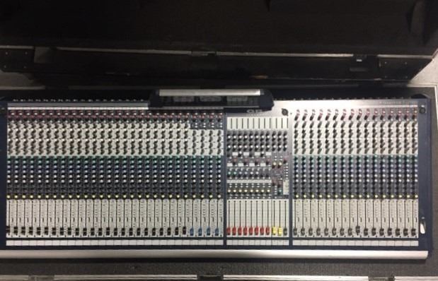 40 channel Soundcraft GB8 analog mixing console w/meter bridge. 4 band EQ, 8 AUX sends, Hi-Pass, +48V, phase invert, pan, input gain on each channel. 8 bus in addition to LRC outputs. 4 mute groups. TRS ouput (pre or post) available on each channel for sending individual signals to recording interface.