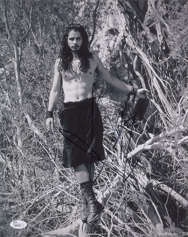 Satin-finish 11 x 14 full-length photo of a shirtless Cornell posing in a wooded area, signed in black felt tip. In fine condition. Accompanied by a certificate of authenticity from JSA.