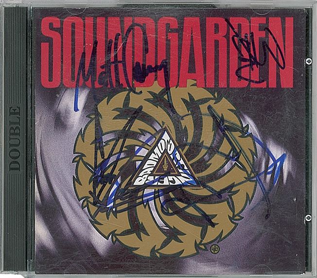 Badmotorfinger CD signed on the front of the booklet in blue or black felt tip by Chris Cornell, Kim Thayil, Ben Shepherd, and Matt Cameron. In fine condition. The CDs are included.