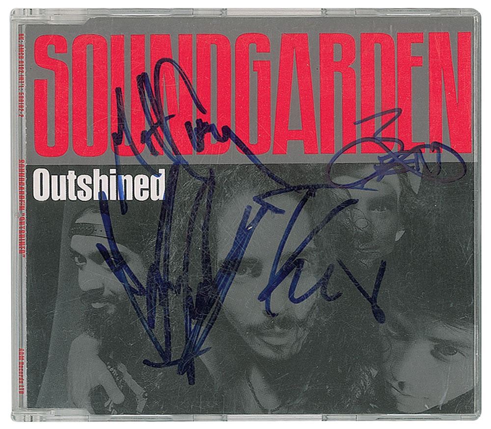 'Outshined' CD single from Soundgarden, signed on the front of the booklet in blue felt tip by Chris Cornell, Kim Thayil, Ben Shepherd, and Matt Cameron. In fine condition. The CD is included. Accompanied by a John Brennan Collection letter of provenance.