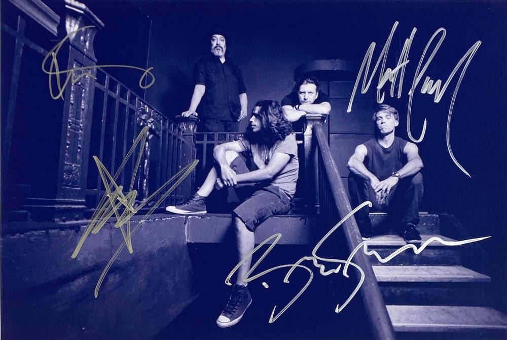 Soundgarden band facsimile facsimile signed photo autographed by Kim Thayil, Matt Cameron, Chris Cornell and Ben Shepherd. 8x10 inches. This item is a reprint of an original autograph