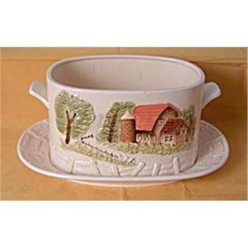 Not quite sure of manufacturer, but have seen a lot of this scenic pottery recently. Japanese made, nicely glazed, not old enough to be badly crazed. It does have a mark, however have been unable to find it in any of my resources or on the NET... it is a stylized capital "M" with slanted legs and a small capital "R" right in under the ditch on the M... If you know this mark , please be kind enough to let me know- thanks... A big thank you to "FROG" for letting us know that this was part of a set of kitchen ware made for Sears. Late 70s', it included such other members as salt & pepper, mugs, teapot, canisters and the like. Unfortunately we do not have the lid or ladle to this part of the set but the pieces we have are in excellent condition.Order three of anything that we can ship in one container, pay with PayPal and shipping is FREE...