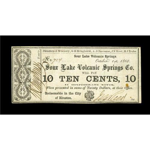 <B>Sour Lake, TX- Sour Lake Volcanic Springs</B></I> 10¢ Oct. 1, 1862 Medlar 7<BR>A wonderfully high grade example from this always in demand issuer. <B>Very Fine.</B></I><BR><I>From The William A. "Bill" Bond Collection</B></I><BR><BR><b>Shipping:</b> Coin/Currency (<a target="_blank" href="http://www.heritageauctions.com/common/shipping.php">view shipping information</a>)