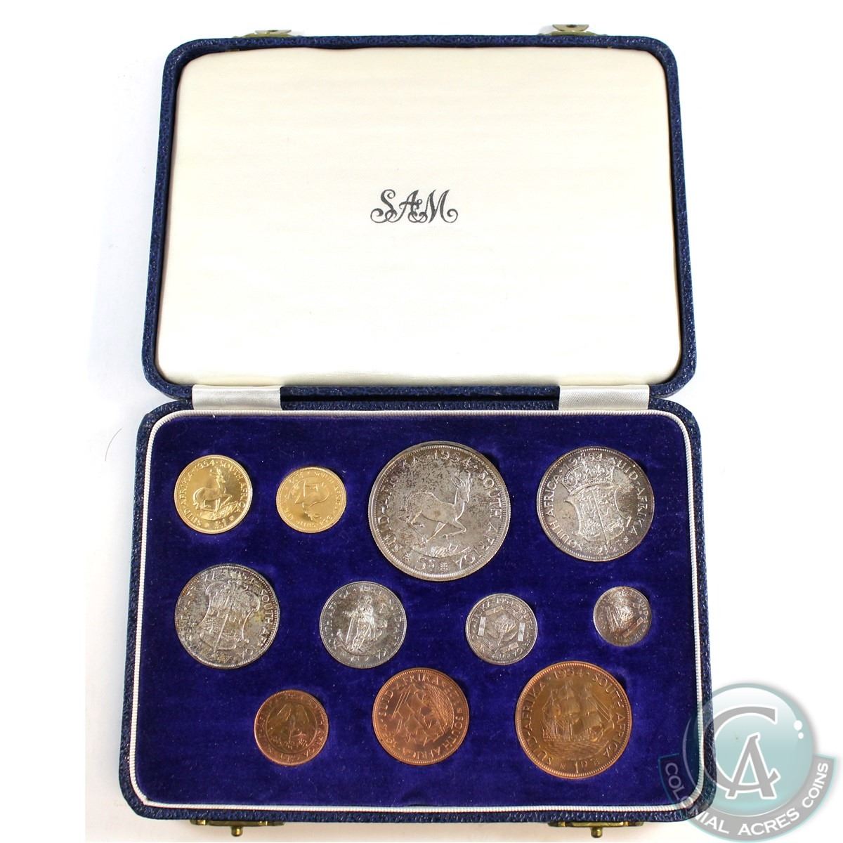 South Africa; KM-PS29 1954 11-coin Proof Set in Original mint issued clamshell case. Set includes the 1/2 and 1 Pound Gold coins. Silver coins contain a light patina while Copper coins contain original bright Red Mint Luster. Original clamshell case is in nice condition.