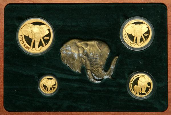 South Africa. Natura Proof Set: 1/10, ¼, ½ and 1 Ounce, 1996. KM-201-204. Total weight 1.85 ounces. Elephant's. In original wood presentation case. With Certificate of Authenticity #04. Lot of 4 coins. Choice Brilliant Proof.