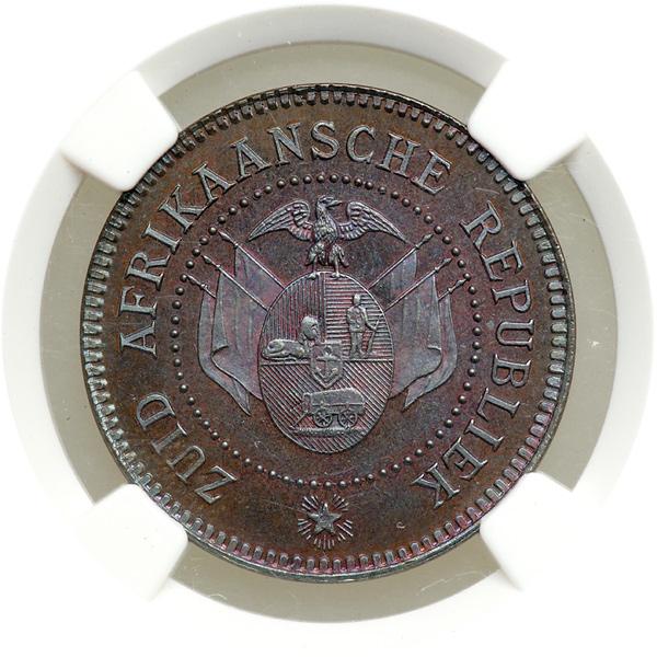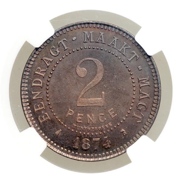 South Africa. Pattern 2 Pence, 1874. KM-PNA5 (X#PN3). Bronze. Plain edge. Zuid-Afrikaansche Republiek. Arms in inner circle. Reverse: Value and date. NGC graded MS-66 Red & Brown.