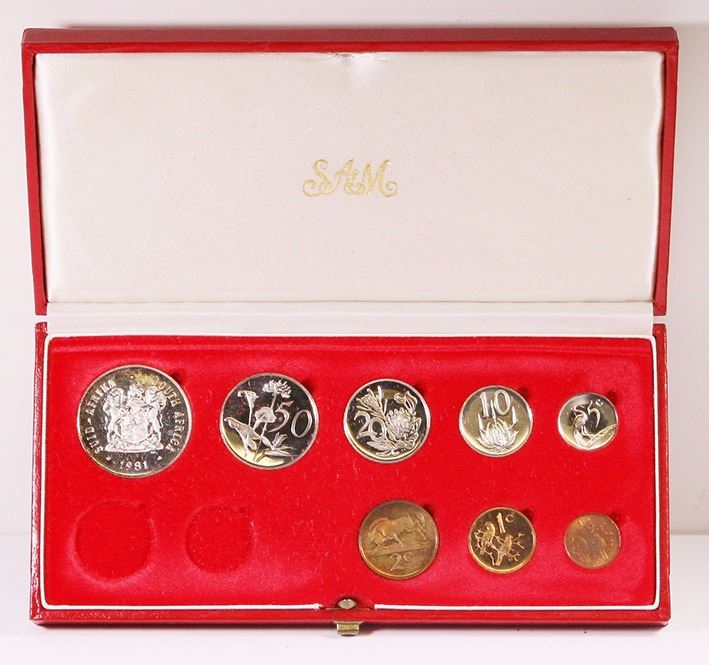 South Africa, proof set, 1981 (KM.PS.113), eight coin set, missing the gold One and Two Rand and silver One Rand (KM.88, ASW 0.3858), all housed in red leather case of issue, the silver tarnished and copper with toning, else nearly as struck (1 set, 8 coins)