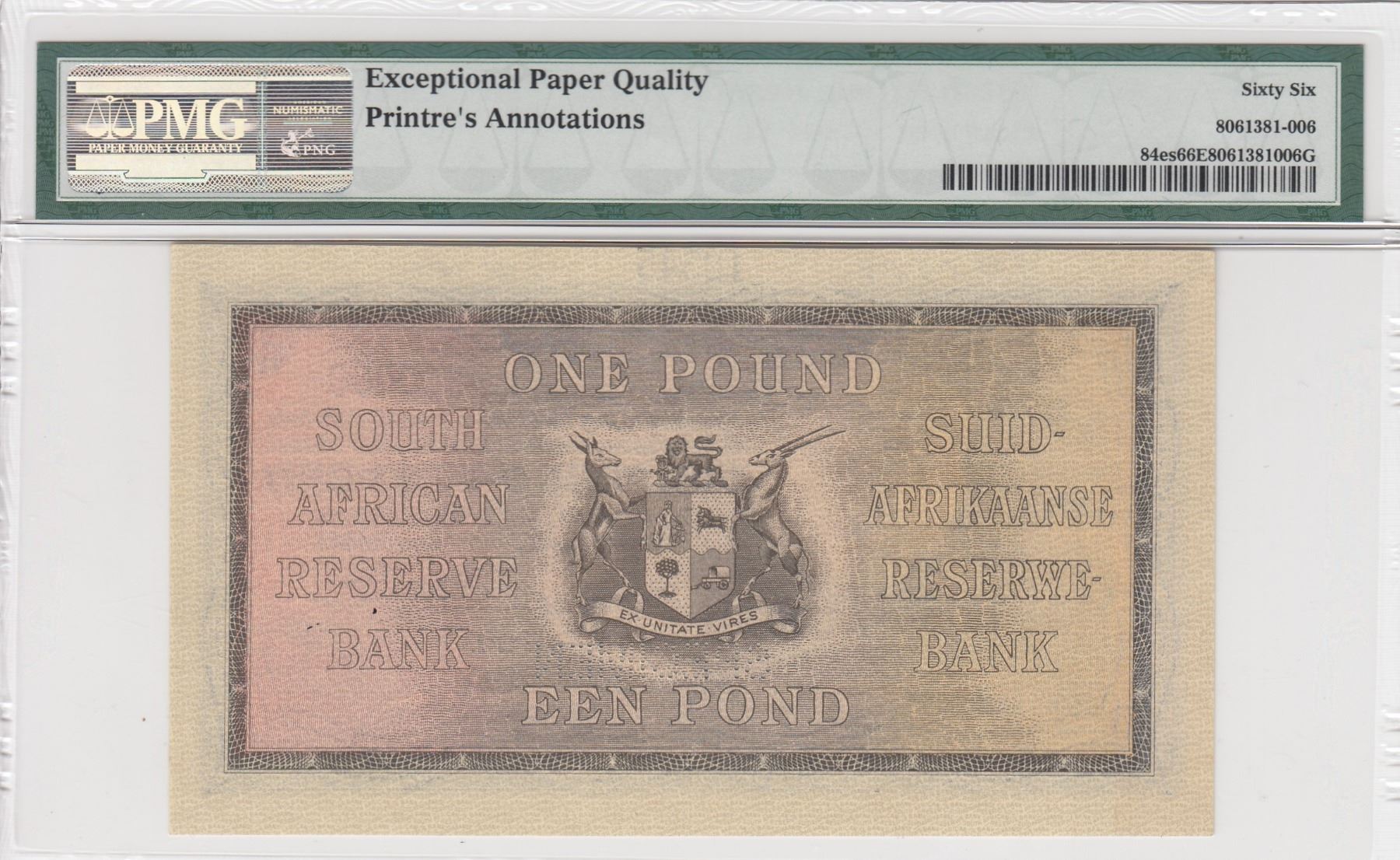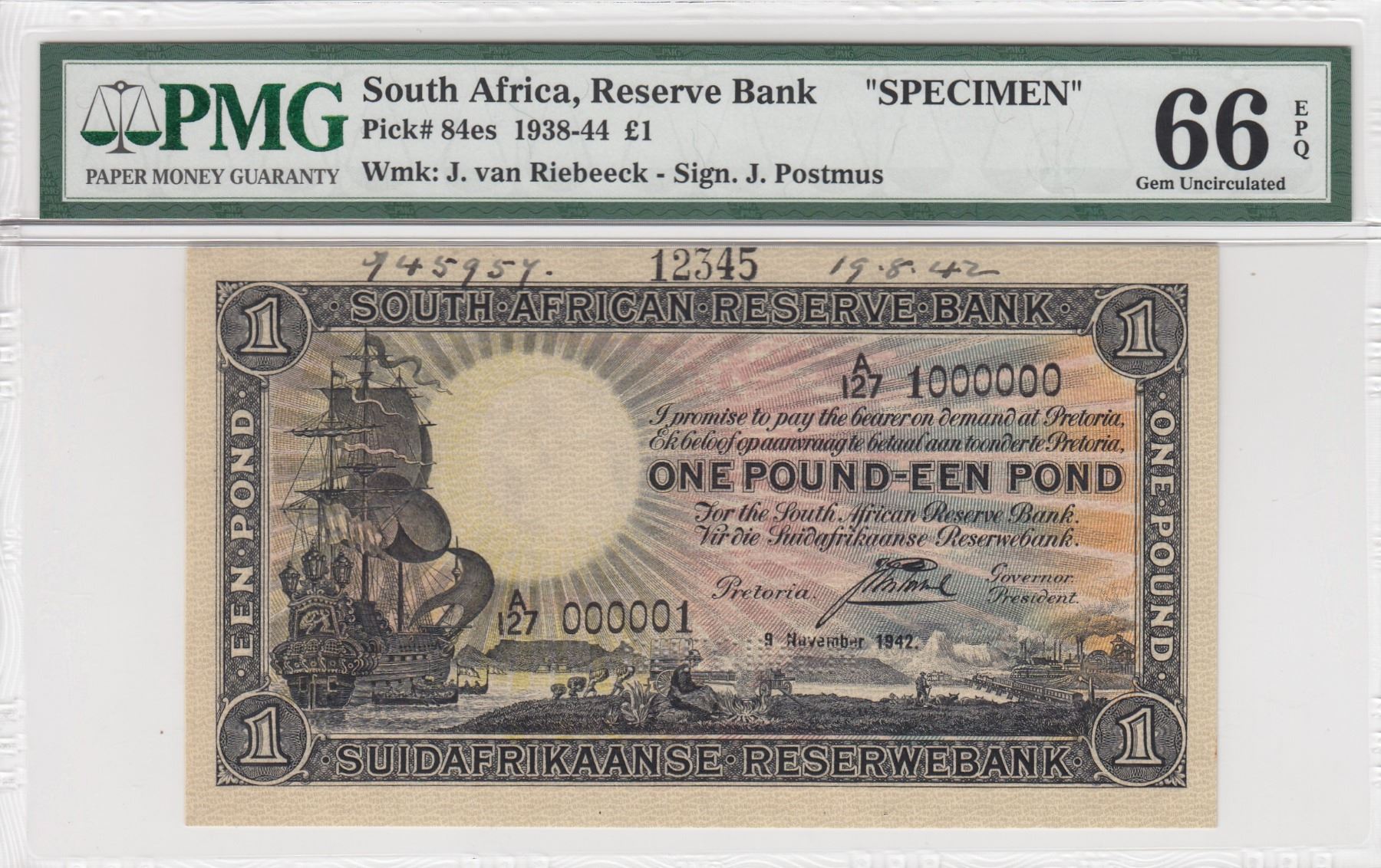 South Africa Republic, 1 Pound, 1938-44, UNC, p84e, SPECIMENbr/PMG 66 EPQ, serial number: A/127 100000
