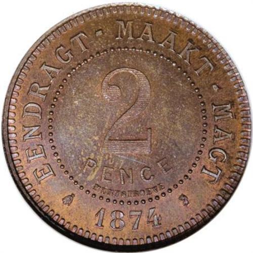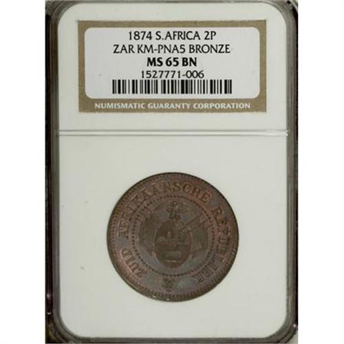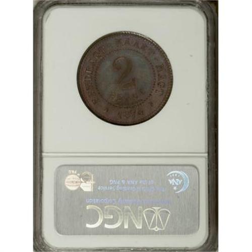 <B>Republic bronze pattern Two Pence 1874,</B></I> KM-PnA5, MS65 BN NGC, nicer than the last, Choice Proof with beautiful surfaces toned bluish brown with patches of faded mint red.<BR><BR><b>Shipping:</b> Coins & Currency (<a target="_blank" href="http://www.heritageauctions.com/common/shipping.php">view shipping information</a>)