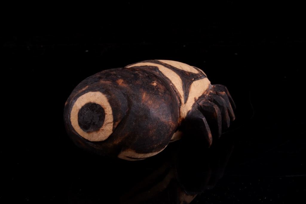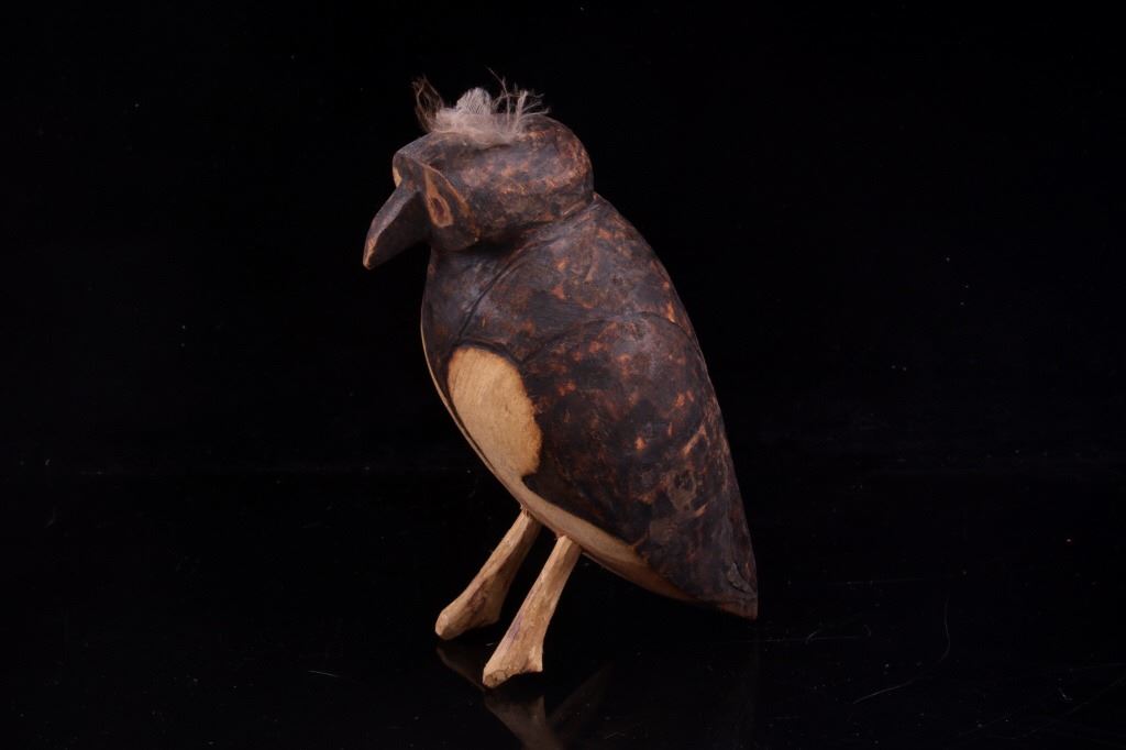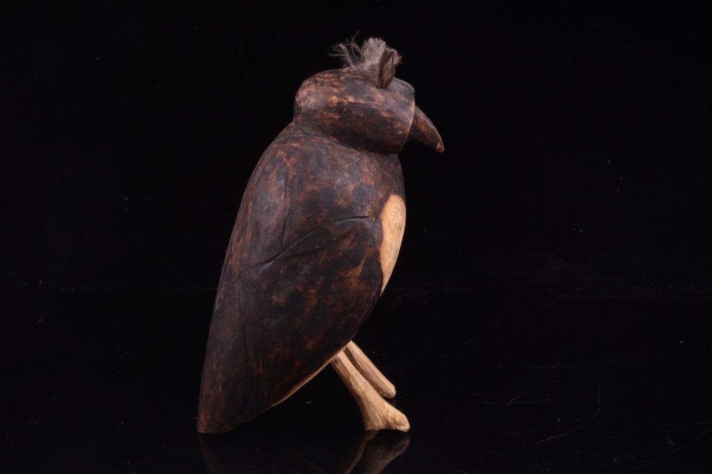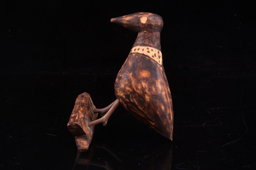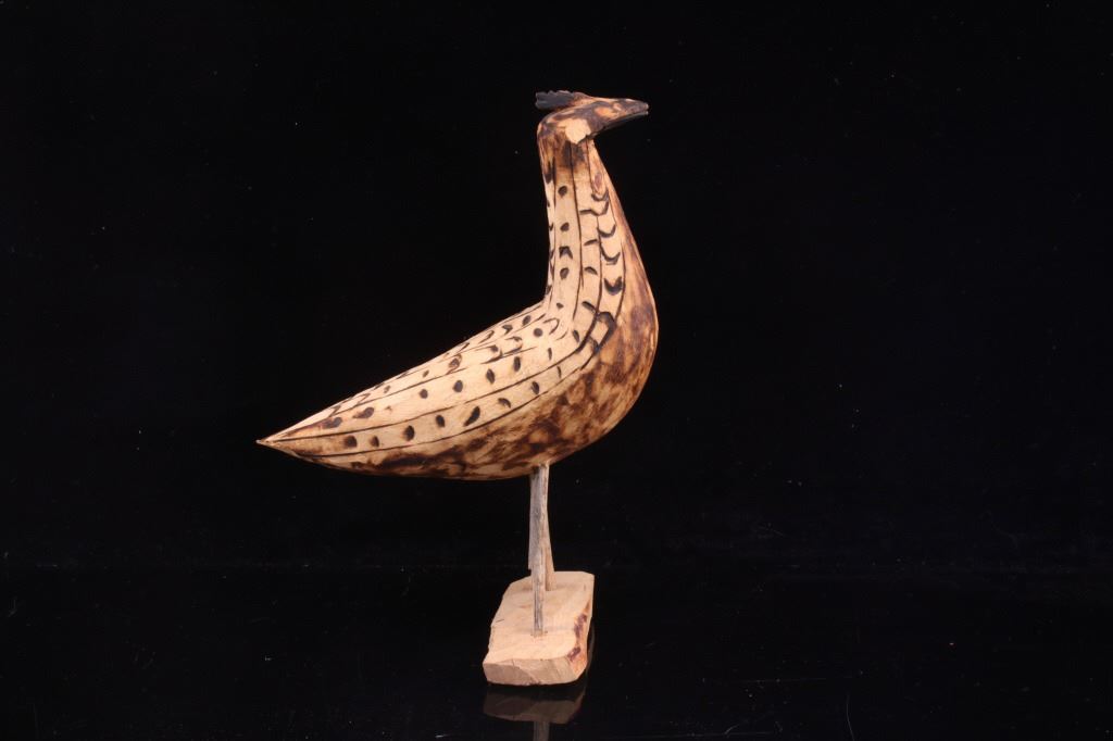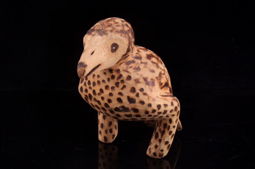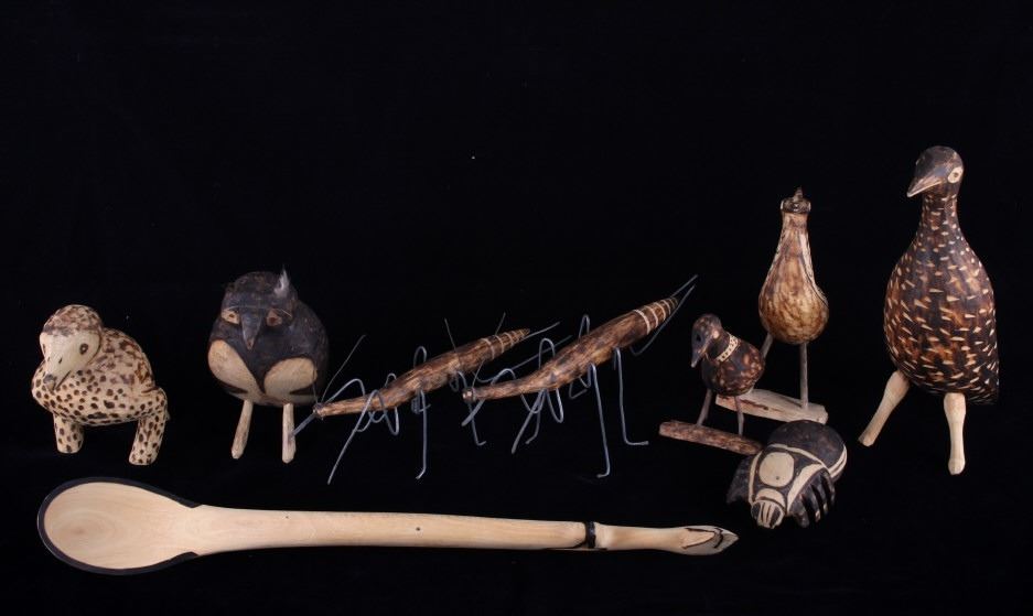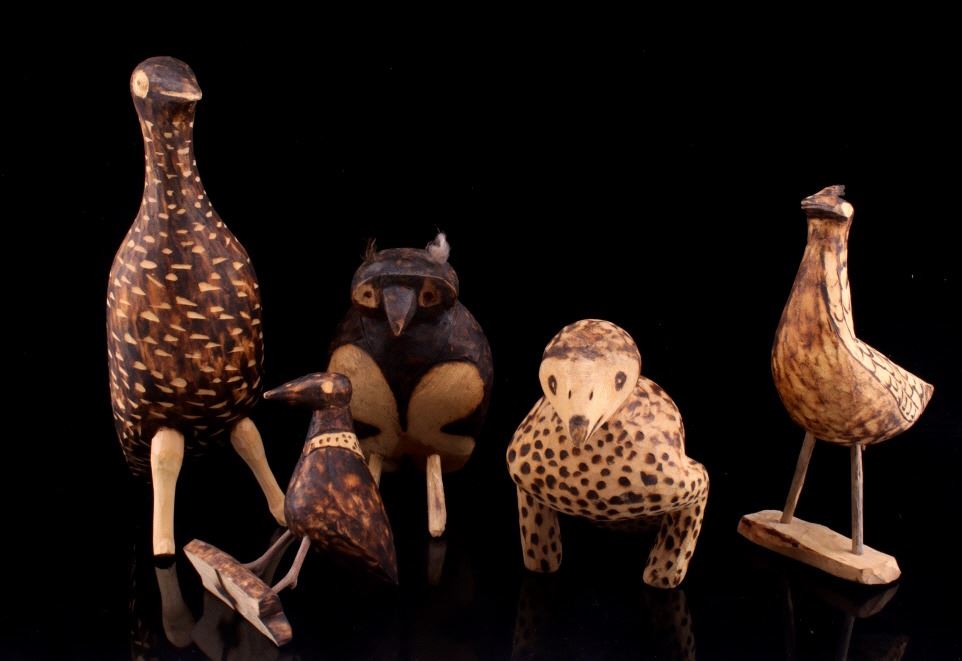 Featured in this lot is this South African Bushman hand carved animal collection. The collection shows three insect figures, five bird figures, and a carved bird spoon. The first two insects are long tubular bugs with wire legs and fire blackened for texture. The last is a spider fetish that is well crafted and shows the likeness of a spider with fire blacked decoration for coloration. There are five different species of birds in this collection. The first is the largest and shows a speckled body with fire blackened coloration. The second shows a rooster hawk on top of the head with a fire darkened belly and speckled wings. The third is an owl figure with fire blackened body and white breasts. The fourth is a shorter, black spotted decoration with the spots shown as fire blackened decoration. The last is the smallest and has an almost full fire blackened body with a white collar and spots around it. The spoon shows a Hornbill head to the spoon and a wide girth lipped spoon base. The Hornbill symbolizes prosperity and fertility in cultural South Africa. The condition of this collection of hand-carved figures is good, with no obvious signs of damage. The measurements of this collection of birds are 9" x 2 1/2" x 4 1/2" for the largest bird, 7" x 3 1/4" x 5" for the second largest, 5 3/4" x 3 1/4" x 4" for the owl carving, 4 1/2" x 3 1/2" x 4 3/4" for the second to last, and 3"x 3" x 4 1/8" for the smallest bird. The insects measure 3 1/4" x 2 3/4" x 10" for the largest, 2 1/2" x 2 5/8" x 9 5/8 for the second largest, and 1 1/2" x 2 1/2" x 4" for the spider statue. The spoon measures 17 1/4" x 2 1/2" x 2 1/2".