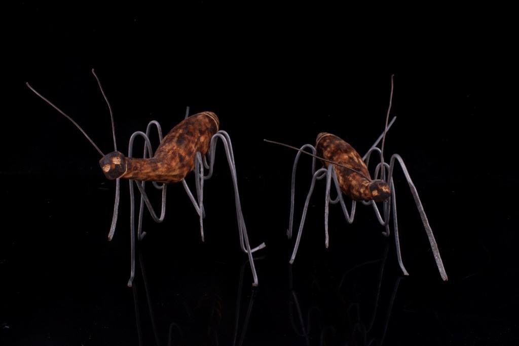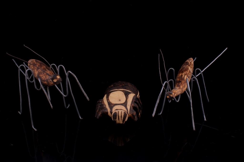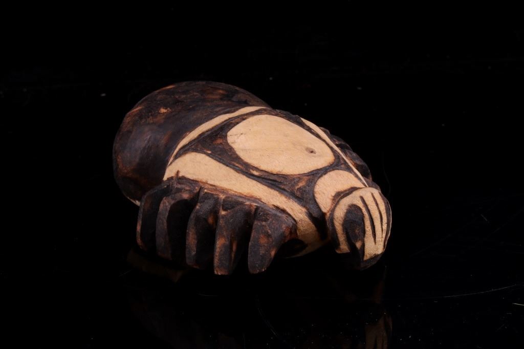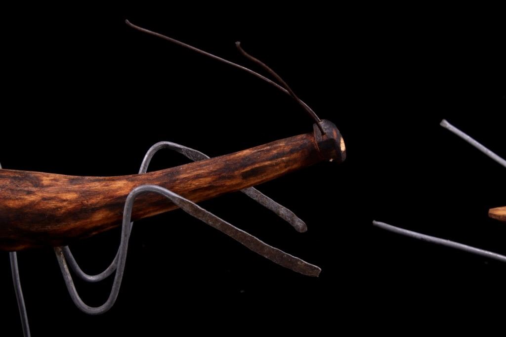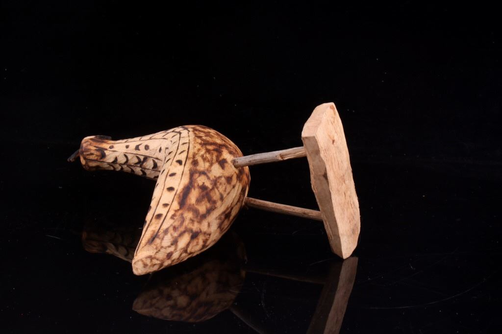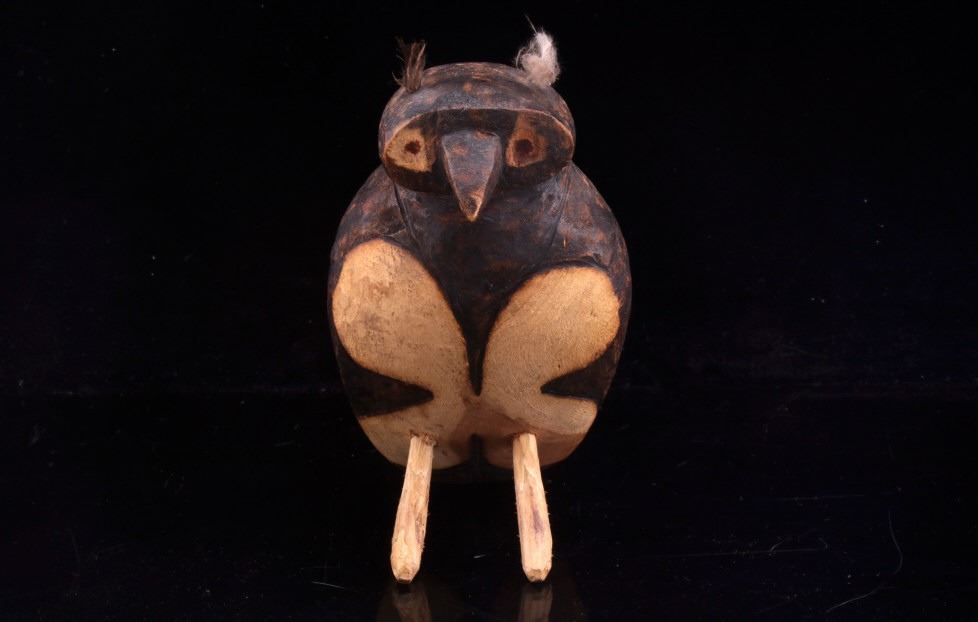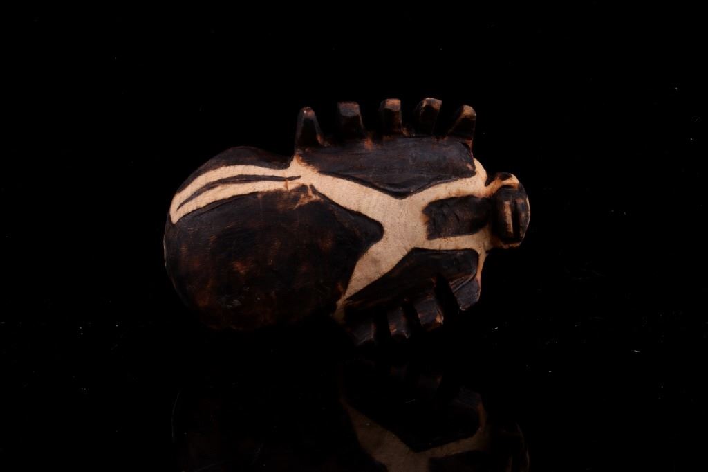 Featured in this lot is this South African Bushman hand carved animal collection. The collection shows three insect figures, five bird figures, and a carved bird spoon. The first two insects are long tubular bugs with wire legs and fire blackened for texture. The last is a spider fetish that is well crafted and shows the likeness of a spider with fire blacked decoration for coloration. There are five different species of birds in this collection. The first is the largest and shows a speckled body with fire blackened coloration. The second shows a rooster hawk on top of the head with a fire darkened belly and speckled wings. The third is an owl figure with fire blackened body and white breasts. The fourth is a shorter, black spotted decoration with the spots shown as fire blackened decoration. The last is the smallest and has an almost full fire blackened body with a white collar and spots around it. The spoon shows a Hornbill head to the spoon and a wide girth lipped spoon base. The Hornbill symbolizes prosperity and fertility in cultural South Africa. The condition of this collection of hand-carved figures is good, with no obvious signs of damage. The measurements of this collection of birds are 9" x 2 1/2" x 4 1/2" for the largest bird, 7" x 3 1/4" x 5" for the second largest, 5 3/4" x 3 1/4" x 4" for the owl carving, 4 1/2" x 3 1/2" x 4 3/4" for the second to last, and 3"x 3" x 4 1/8" for the smallest bird. The insects measure 3 1/4" x 2 3/4" x 10" for the largest, 2 1/2" x 2 5/8" x 9 5/8 for the second largest, and 1 1/2" x 2 1/2" x 4" for the spider statue. The spoon measures 17 1/4" x 2 1/2" x 2 1/2".