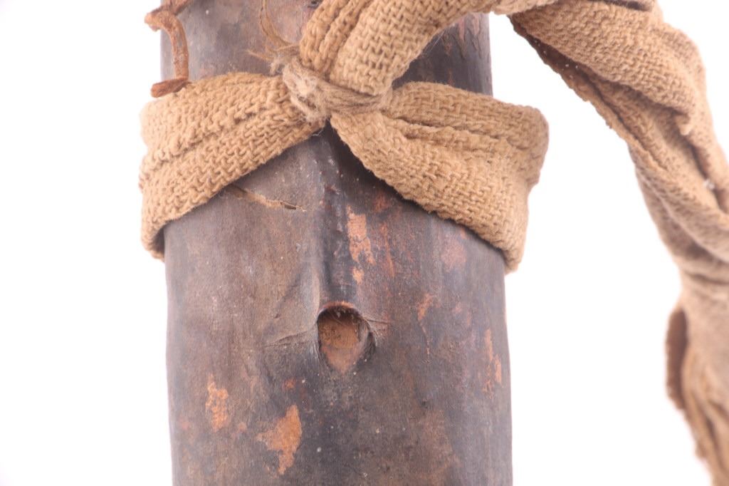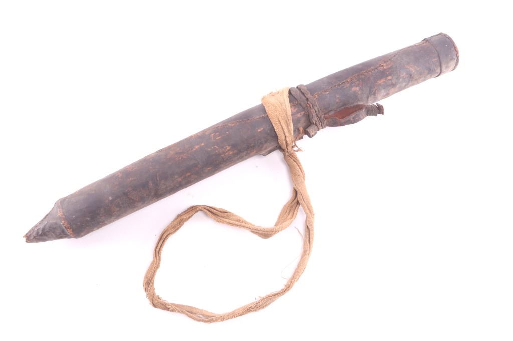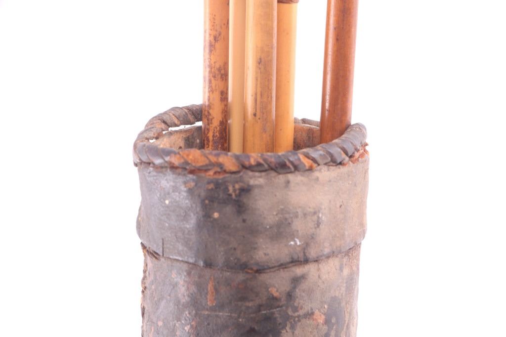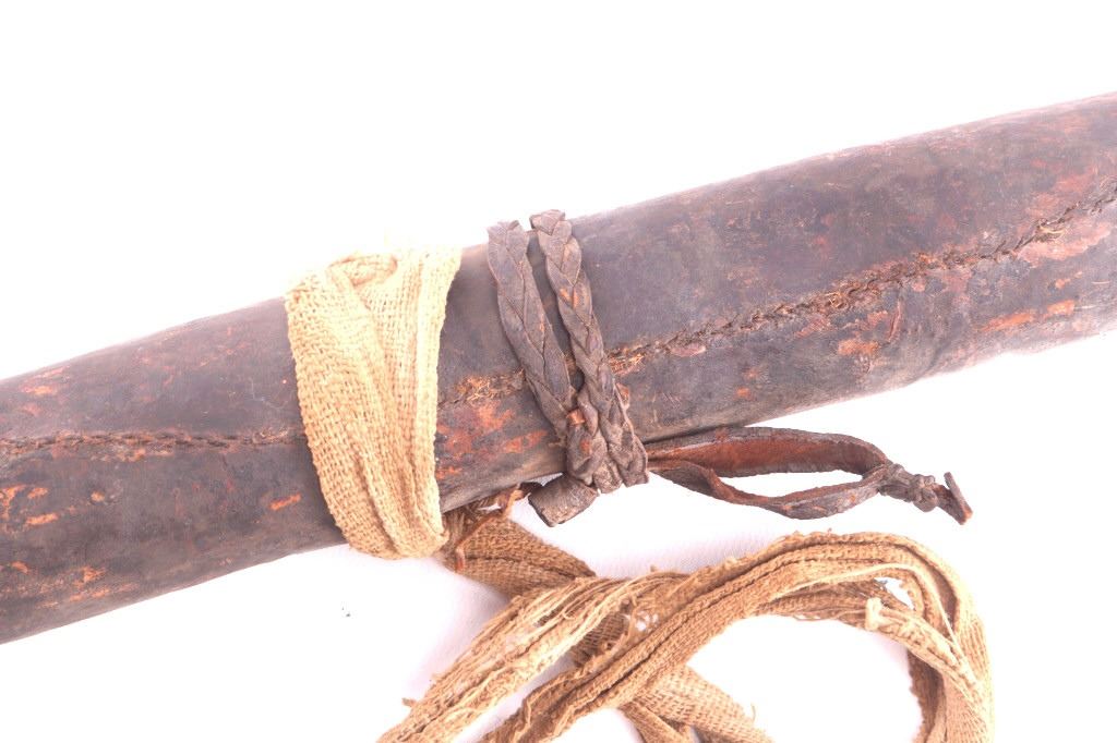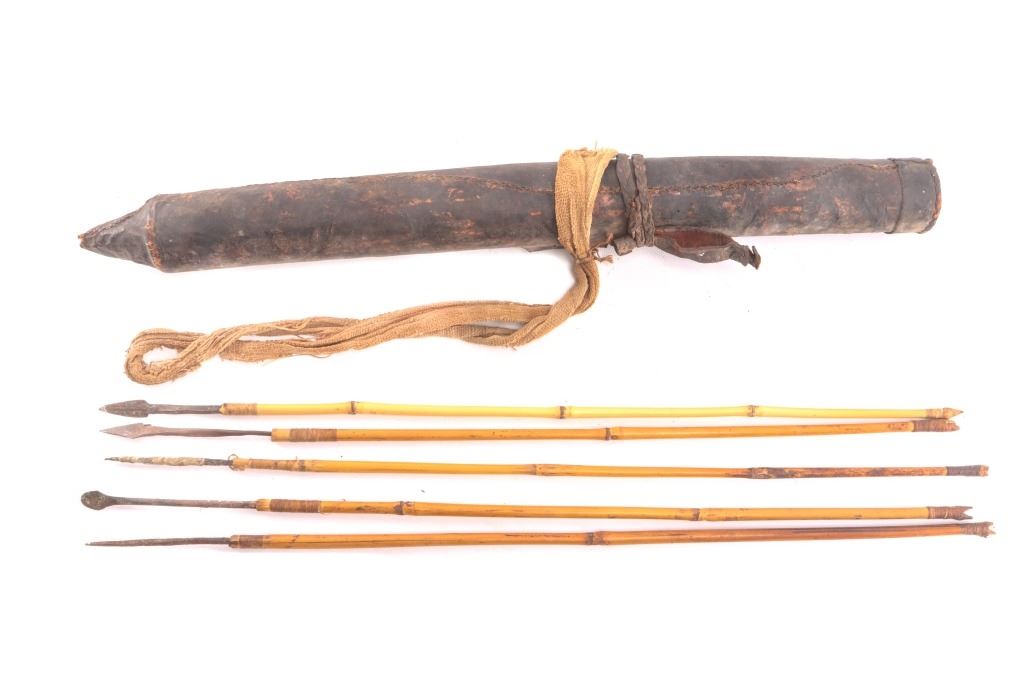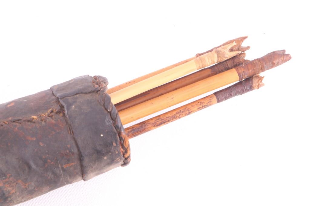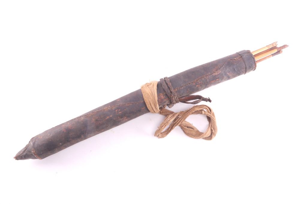 Featured in this lot is this South African Bushman hunting collection, circa early- to mid-1900's and attributed to the 1930's. There are three hunting items in this collection, the first being a South African Bushman hide wrapped quiver with five bamboo shoot arrows and three different arrow heads. The second is a personal items carrying case constructed from hide and leather wrapped bamboo trunk. The last item is a club for personal defense and finishing their prey before harvesting. The condition of this collection is good, with no obvious signs of damage. The measurements of these arrows range from 20 1/4" x 1/2" to 21" x 1/4" and the quiver measures 20 1/2" x 2 1/2" x 2 1/4".