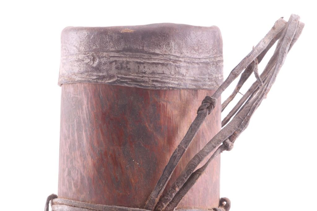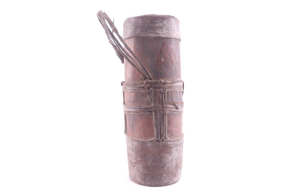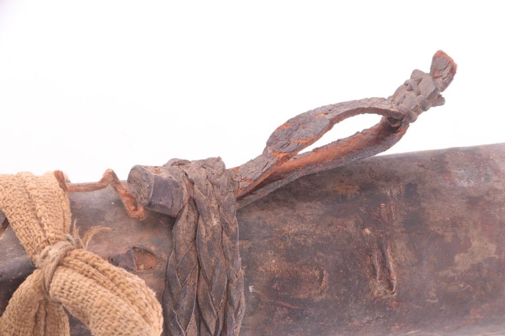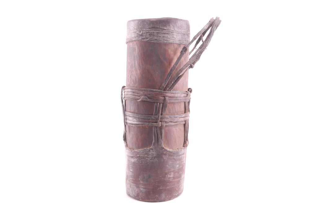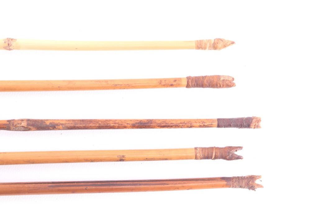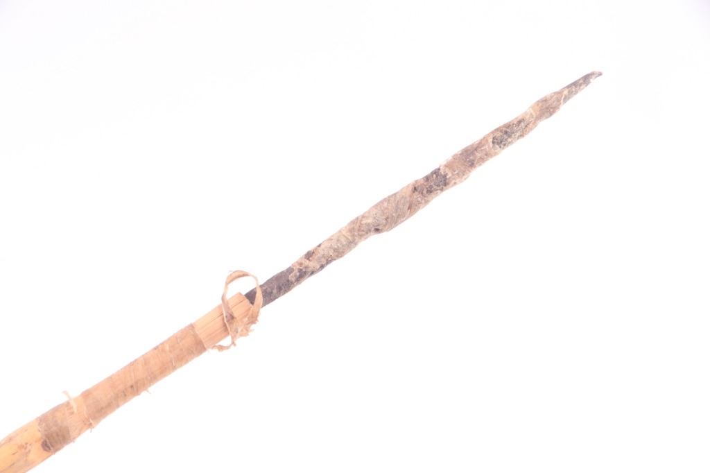 Featured in this lot is this South African Bushman hunting collection, circa early- to mid-1900's and attributed to the 1930's. There are three hunting items in this collection, the first being a South African Bushman hide wrapped quiver with five bamboo shoot arrows and three different arrow heads. The second is a personal items carrying case constructed from hide and leather wrapped bamboo trunk. The last item is a club for personal defense and finishing their prey before harvesting. The condition of this collection is good, with no obvious signs of damage. The measurements of these arrows range from 20 1/4" x 1/2" to 21" x 1/4" and the quiver measures 20 1/2" x 2 1/2" x 2 1/4".