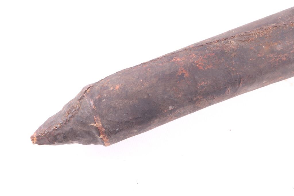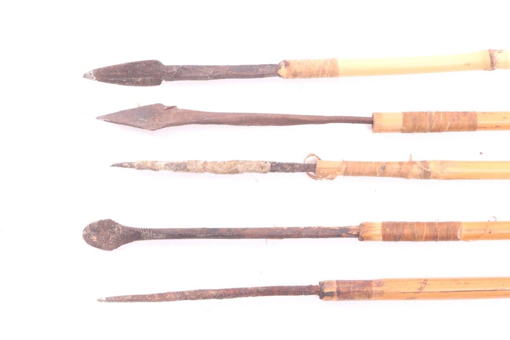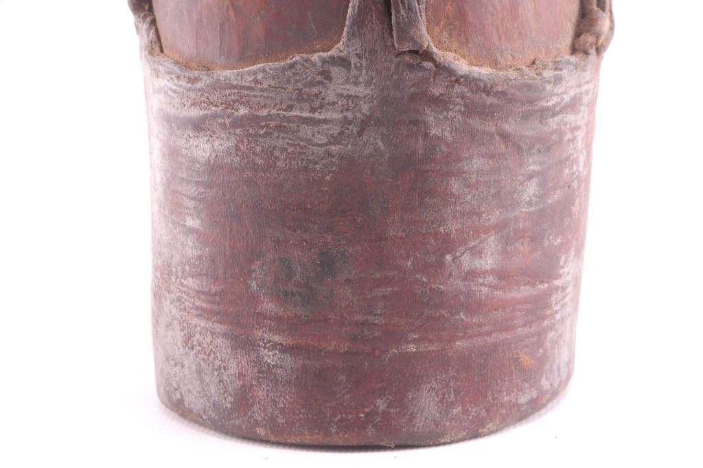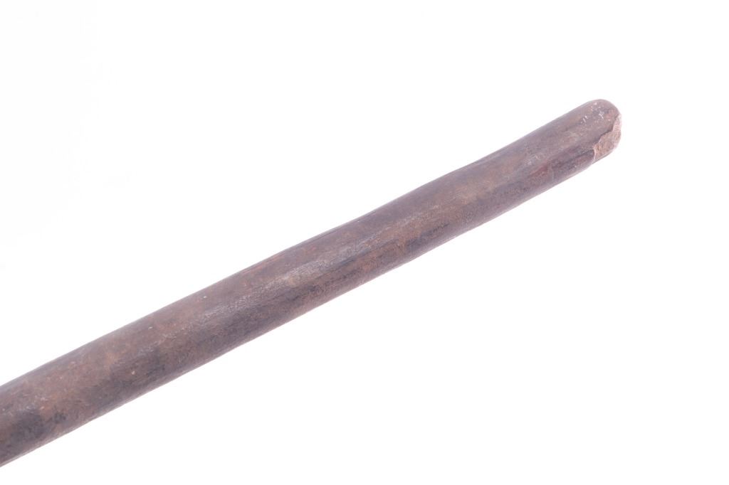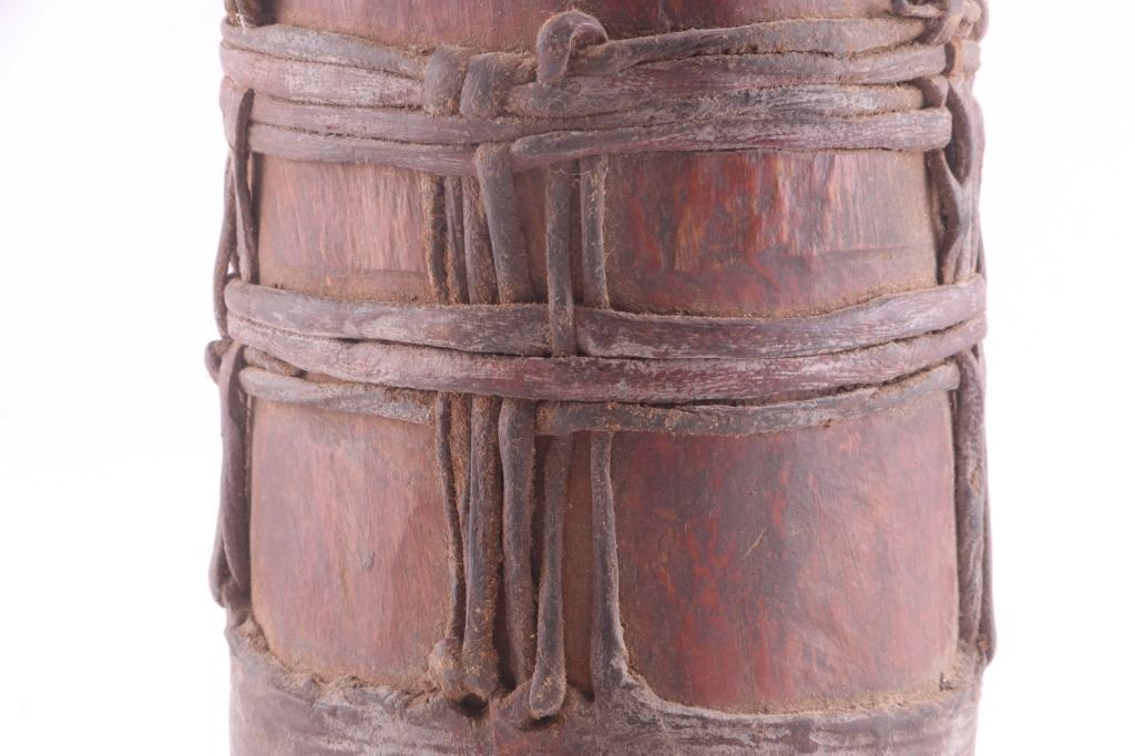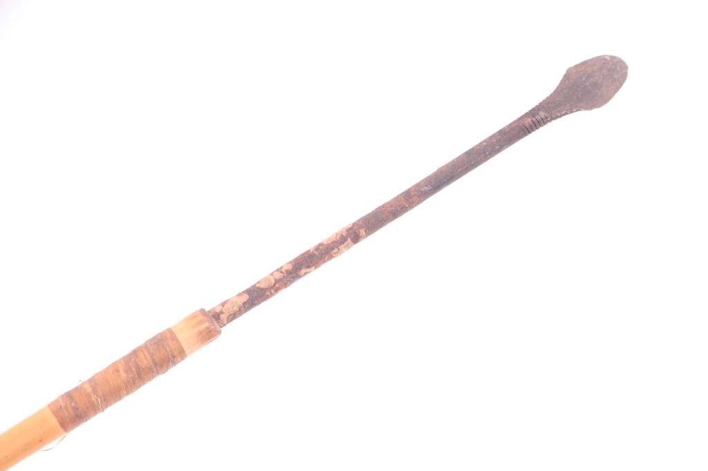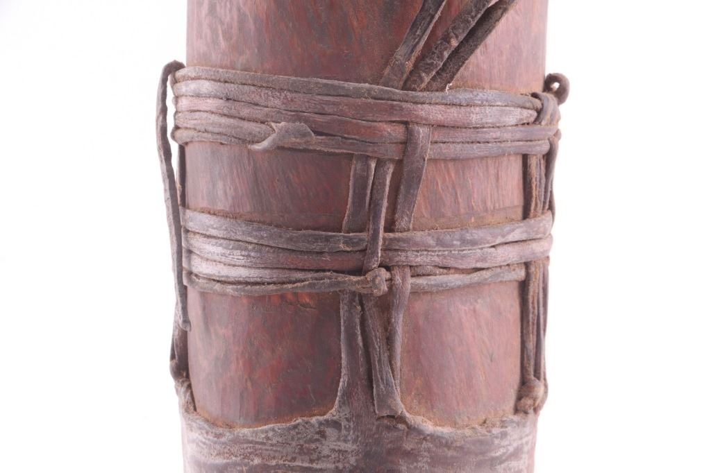 Featured in this lot is this South African Bushman hunting collection, circa early- to mid-1900's and attributed to the 1930's. There are three hunting items in this collection, the first being a South African Bushman hide wrapped quiver with five bamboo shoot arrows and three different arrow heads. The second is a personal items carrying case constructed from hide and leather wrapped bamboo trunk. The last item is a club for personal defense and finishing their prey before harvesting. The condition of this collection is good, with no obvious signs of damage. The measurements of these arrows range from 20 1/4" x 1/2" to 21" x 1/4" and the quiver measures 20 1/2" x 2 1/2" x 2 1/4".