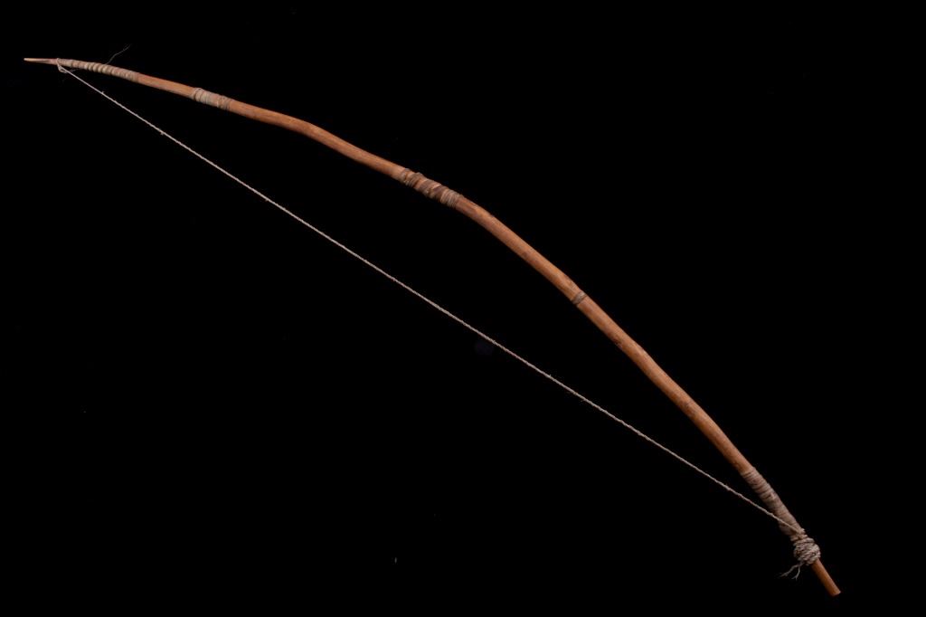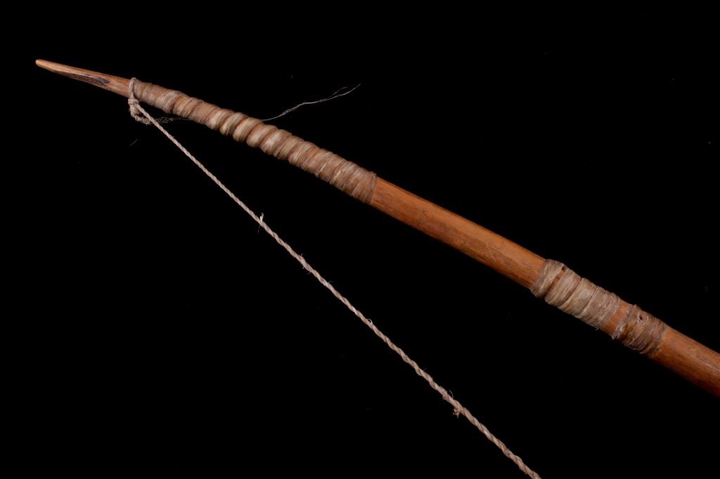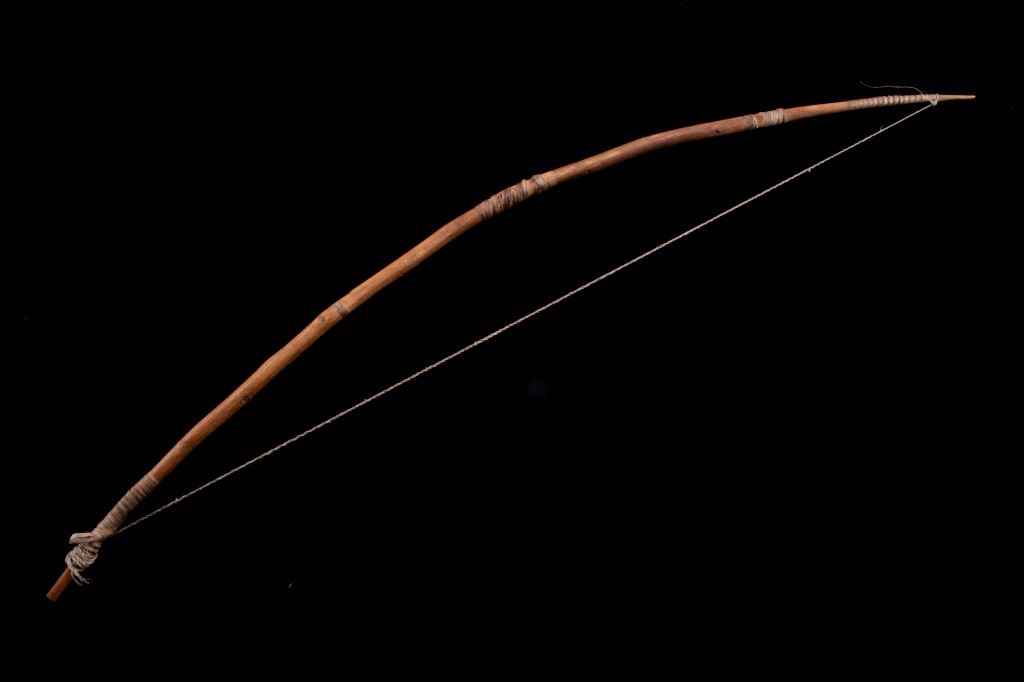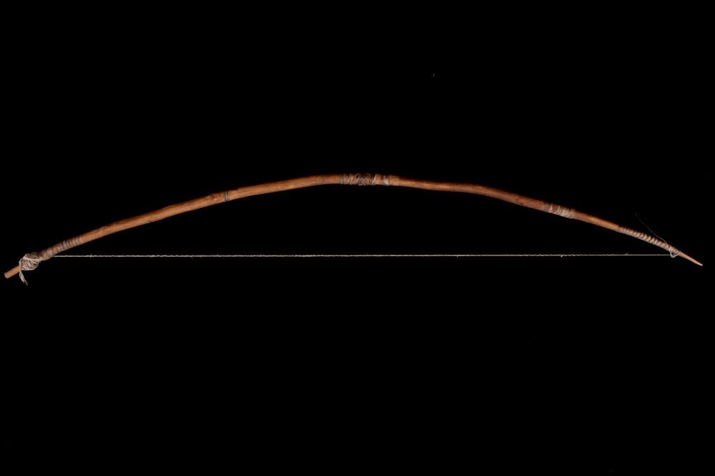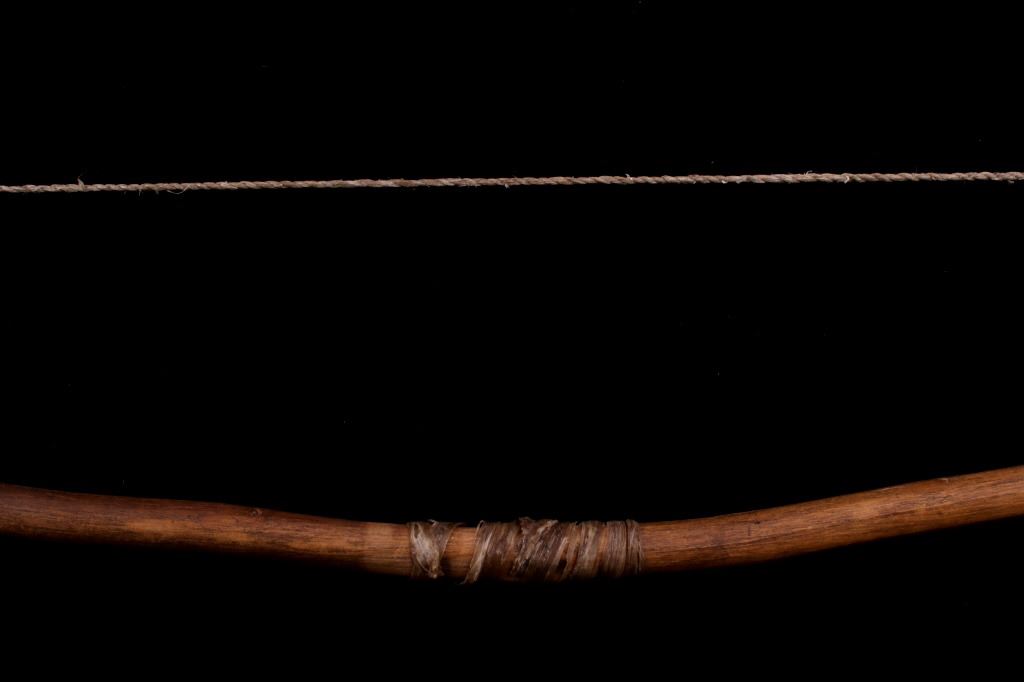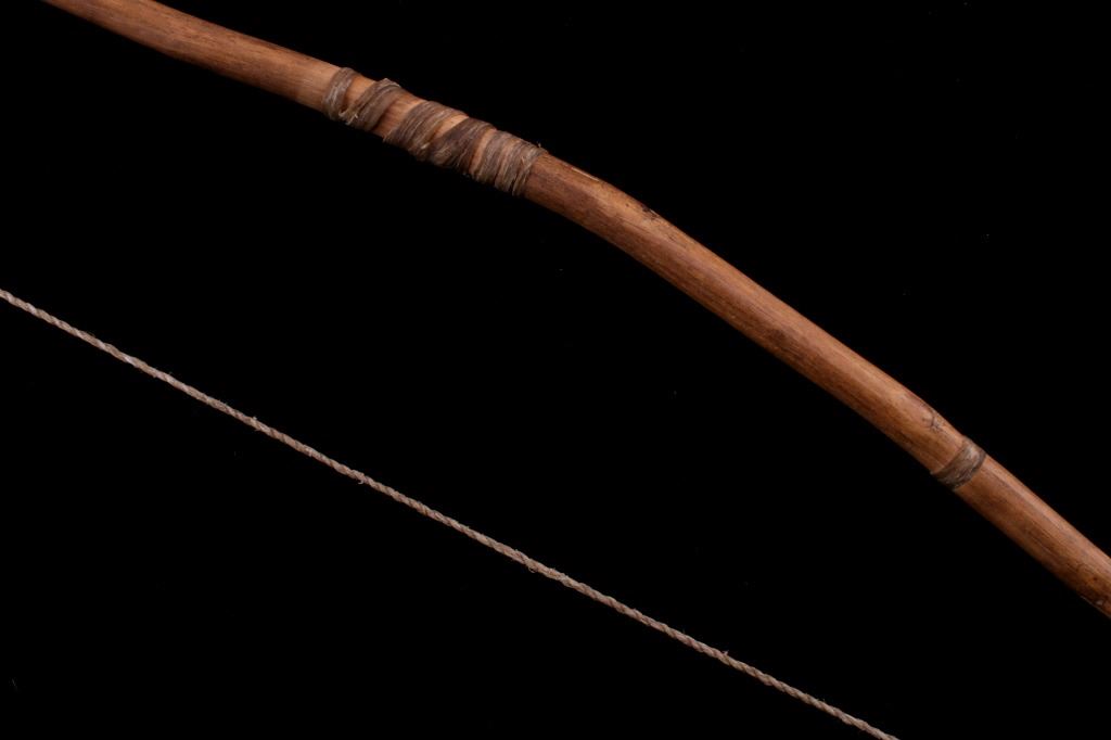 Featured in this lot is this South African handmade musical bow, circa 1950's. The music bow features a hard wood branch construction with sinew wrapped sections and a waxed bow string. The musical bow (bowstring or string bow, a subset of bar zithers) is a simple string instrument used by a number of South African peoples. The condition of this music bow is fair, with no obvious signs of damage; it features a loosely wrapped grip. The measurements of this music bow are 32" x 3 3/4" x 1/2".