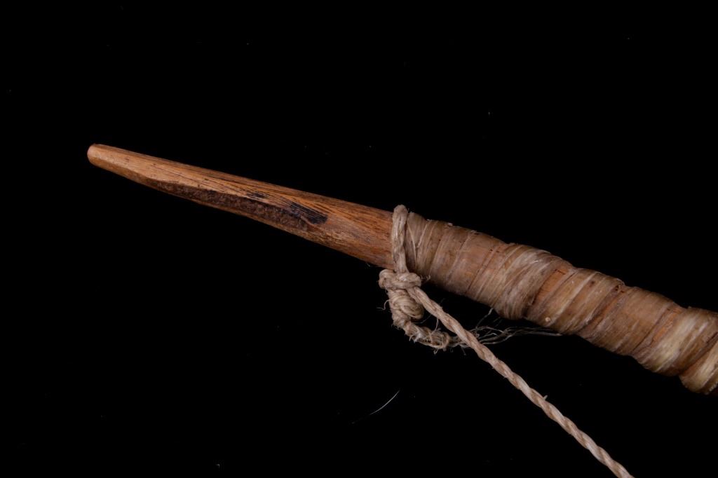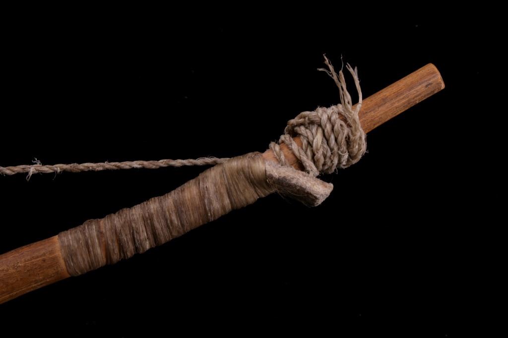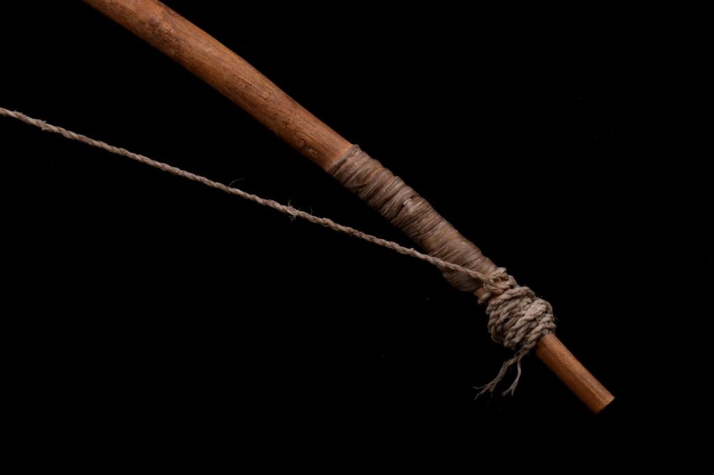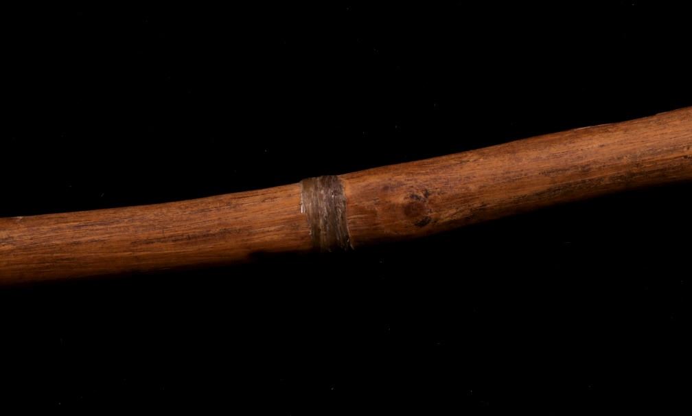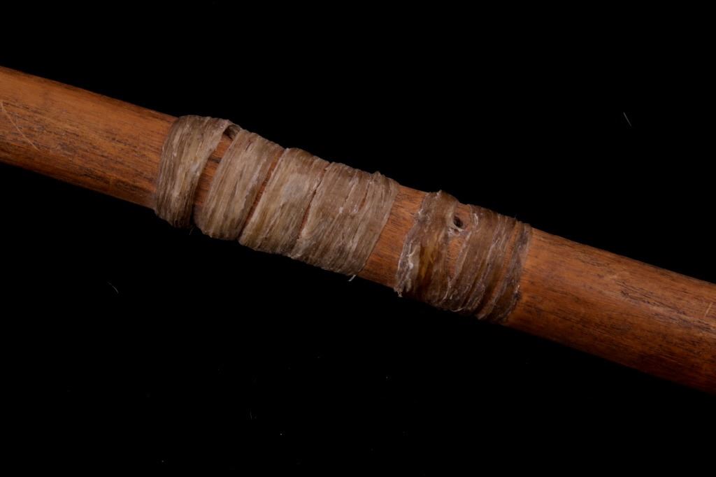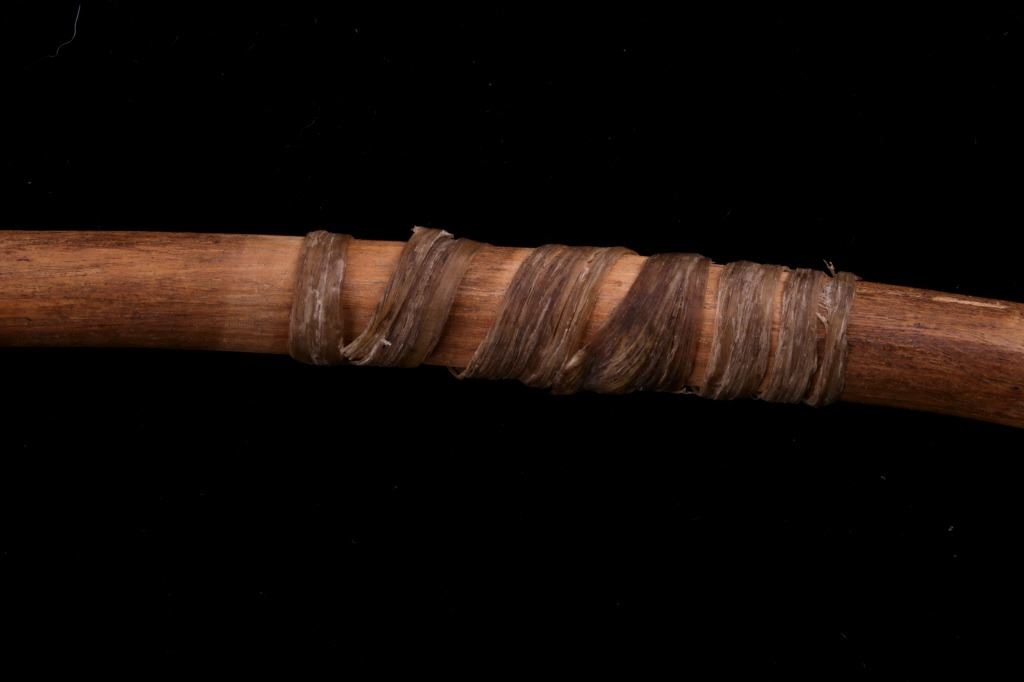 Featured in this lot is this South African handmade musical bow, circa 1950's. The music bow features a hard wood branch construction with sinew wrapped sections and a waxed bow string. The musical bow (bowstring or string bow, a subset of bar zithers) is a simple string instrument used by a number of South African peoples. The condition of this music bow is fair, with no obvious signs of damage; it features a loosely wrapped grip. The measurements of this music bow are 32" x 3 3/4" x 1/2".
