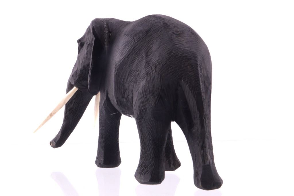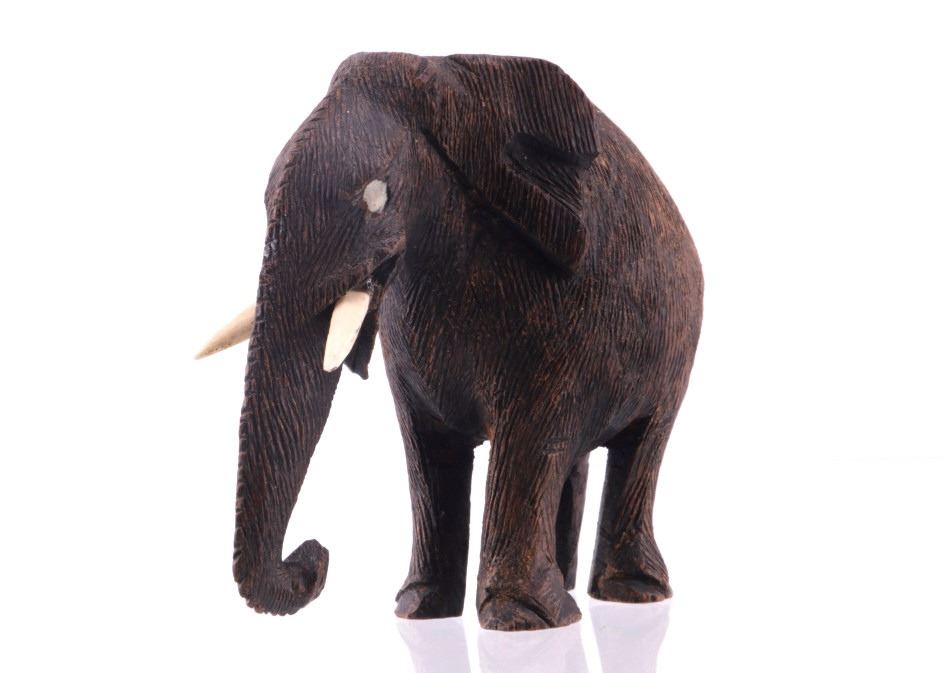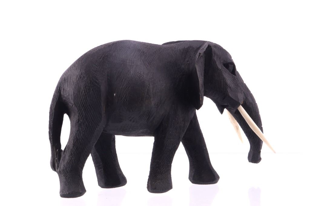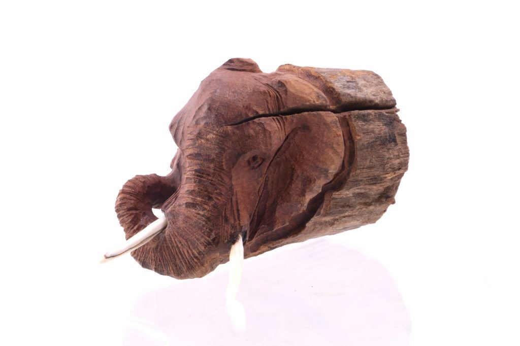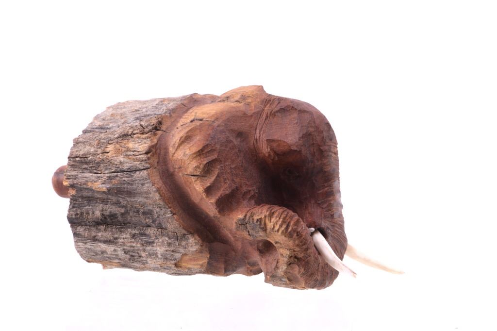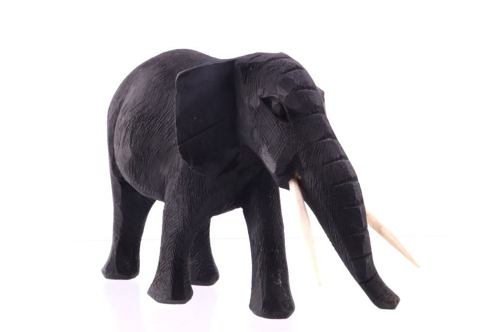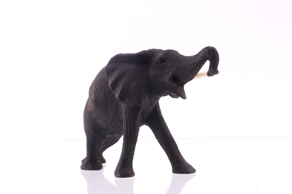 Featured in this lot is this collection of South African Leadwood elephant carvings. There are three carvings and two knobs in this collection. The hand carved elephant statues show wonderful craftsmanship, with warthog tusk tusks and lovely texturing to the skin of the elephants. The two knobs show hand carved construction with warthog tusk tusks and a hand crafted Leadwood dowel shown in the rear of the knob. The condition of these Leadwood elephants is good overall, with the medium size elephant missing one of the warthog tusks. The measurements of this collection of elephant figures range from 3 1/4" x 3 1/2" x 1 1/2" to 4 1/2" x 6 1/2" x 2 1/4".