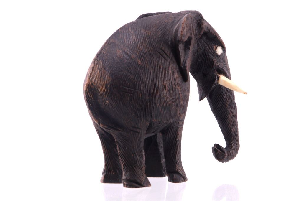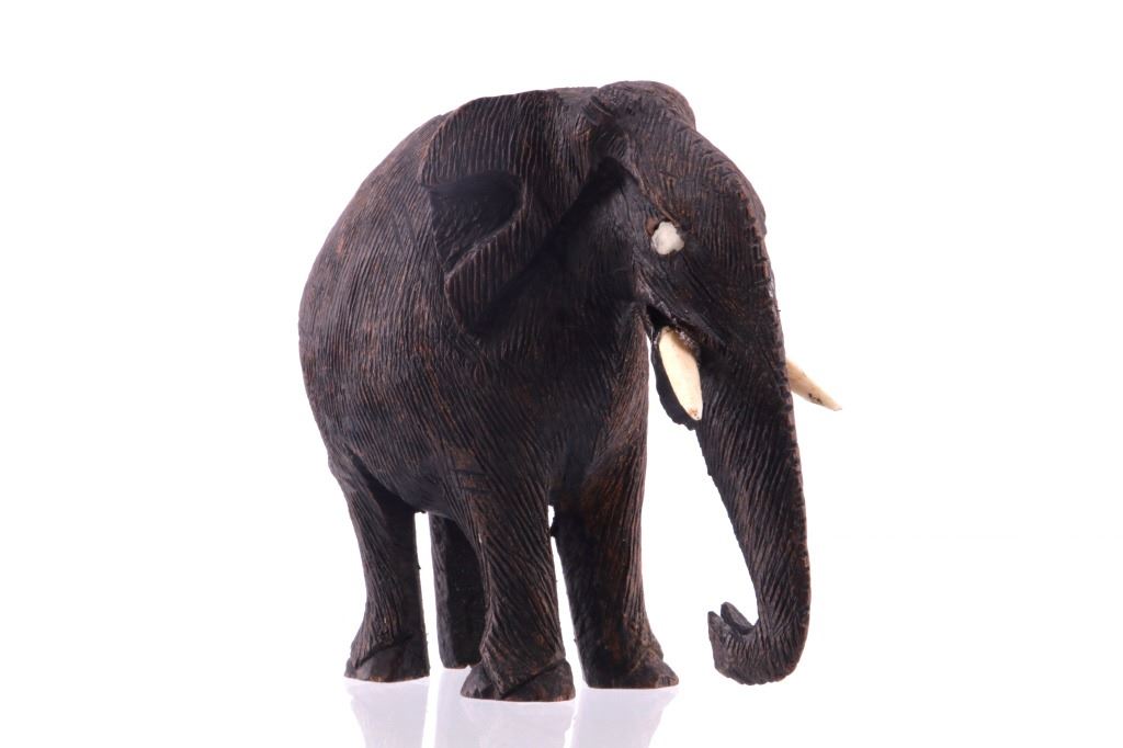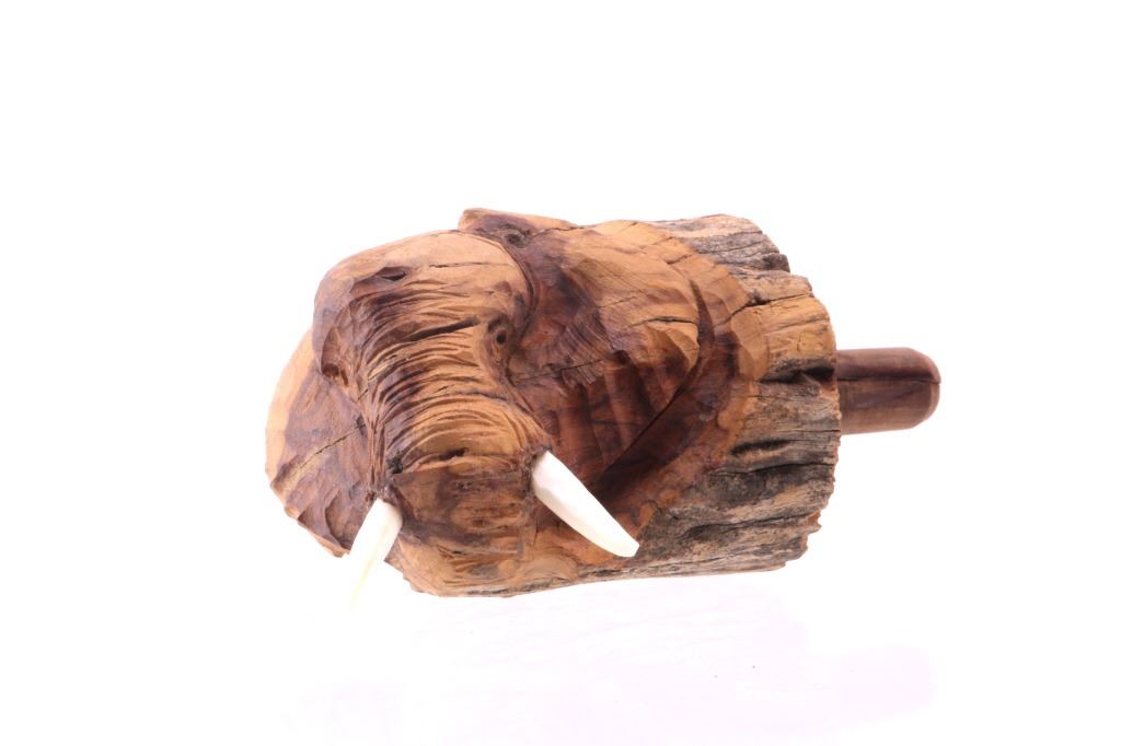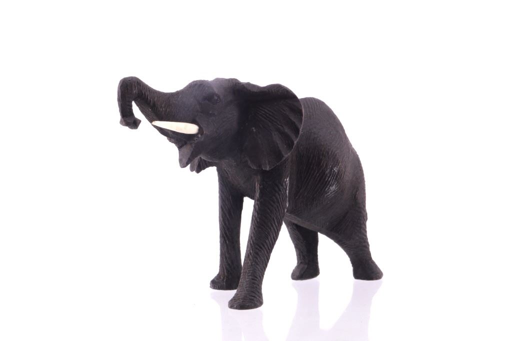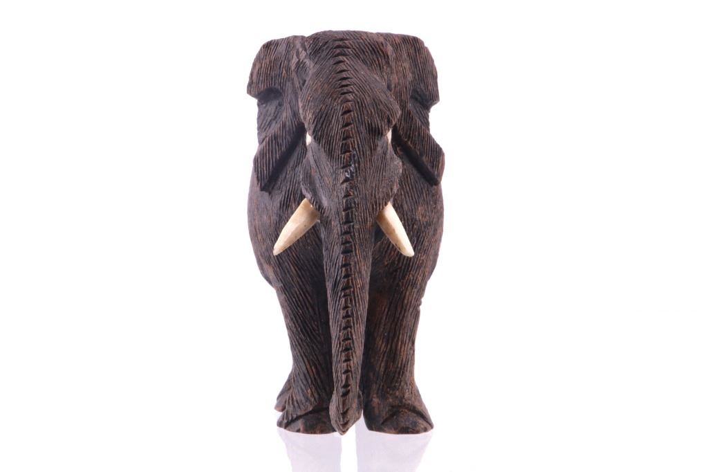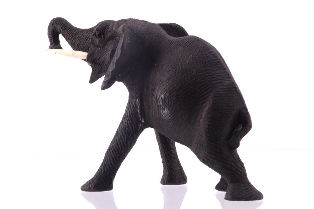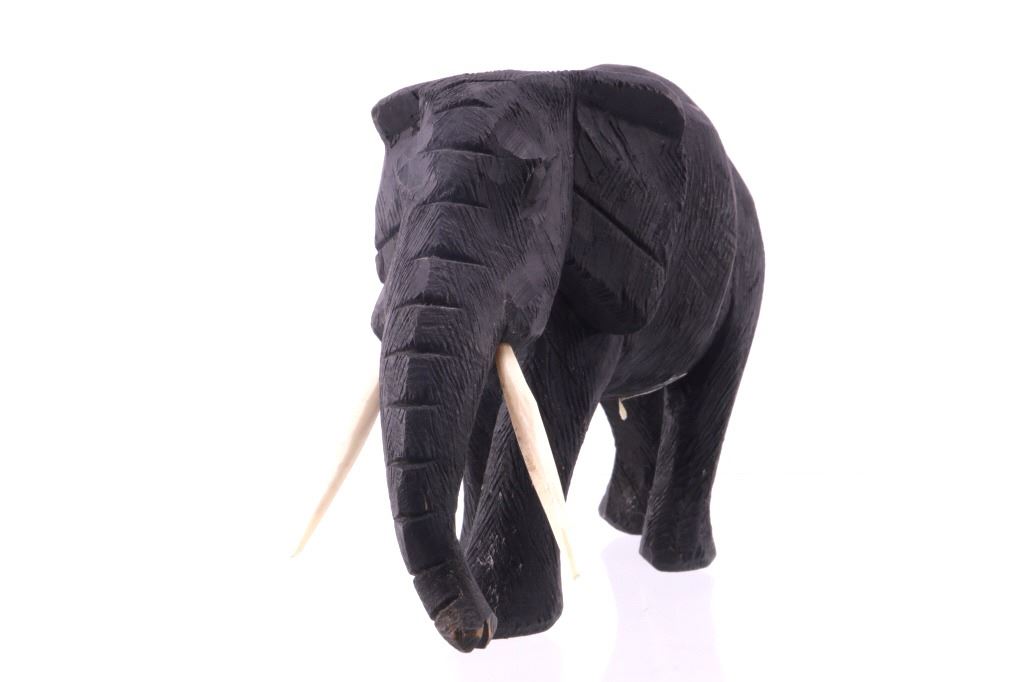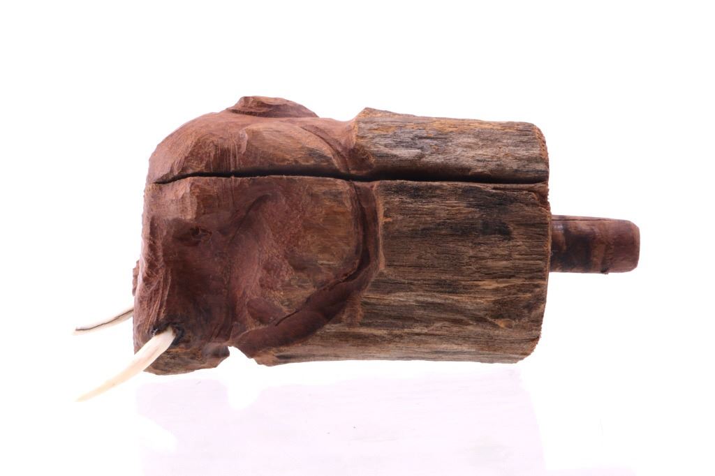 Featured in this lot is this collection of South African Leadwood elephant carvings. There are three carvings and two knobs in this collection. The hand carved elephant statues show wonderful craftsmanship, with warthog tusk tusks and lovely texturing to the skin of the elephants. The two knobs show hand carved construction with warthog tusk tusks and a hand crafted Leadwood dowel shown in the rear of the knob. The condition of these Leadwood elephants is good overall, with the medium size elephant missing one of the warthog tusks. The measurements of this collection of elephant figures range from 3 1/4" x 3 1/2" x 1 1/2" to 4 1/2" x 6 1/2" x 2 1/4".