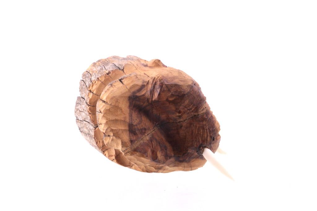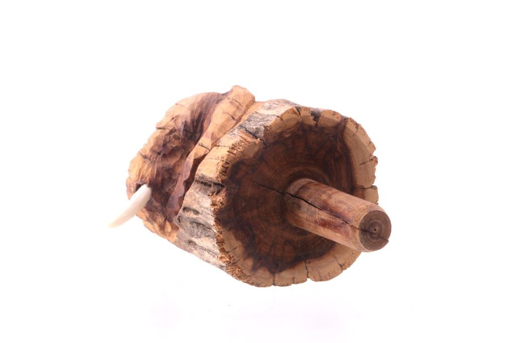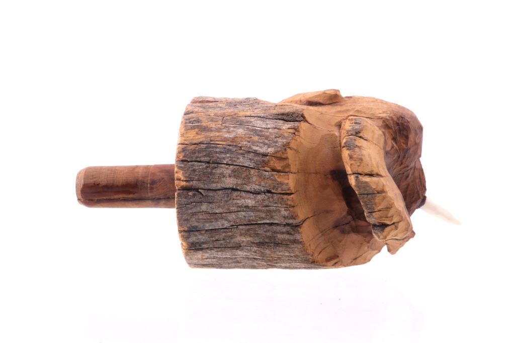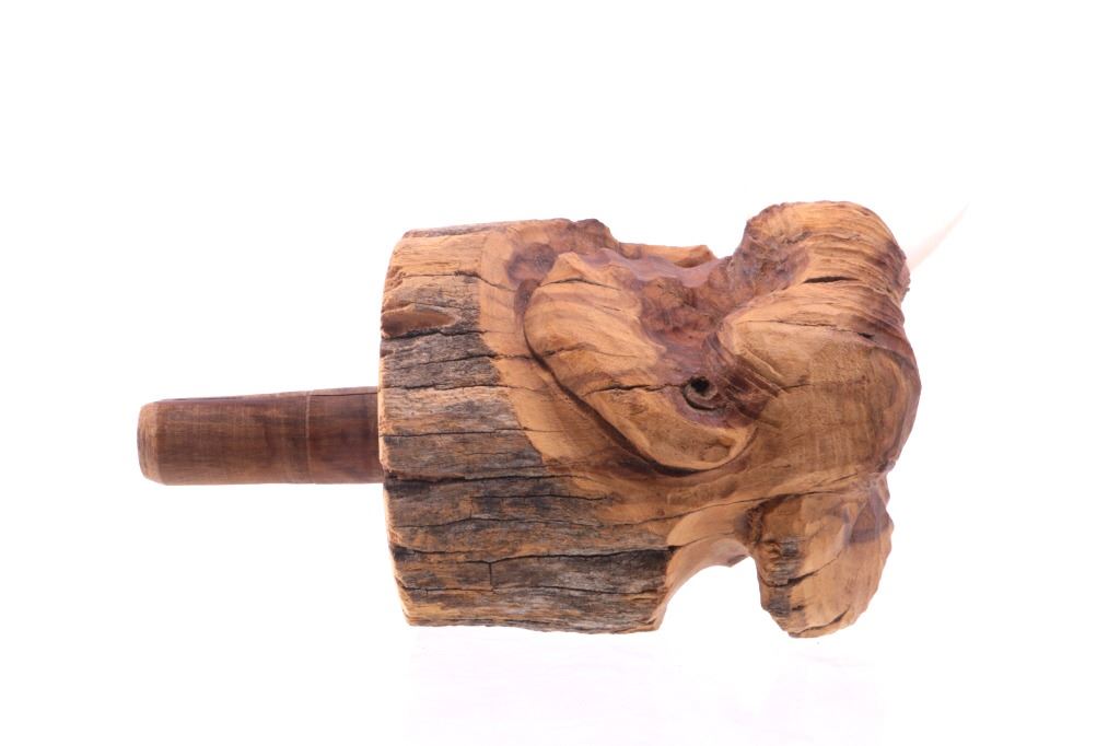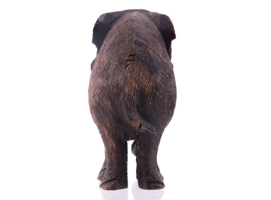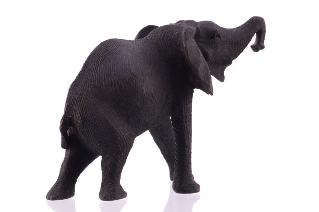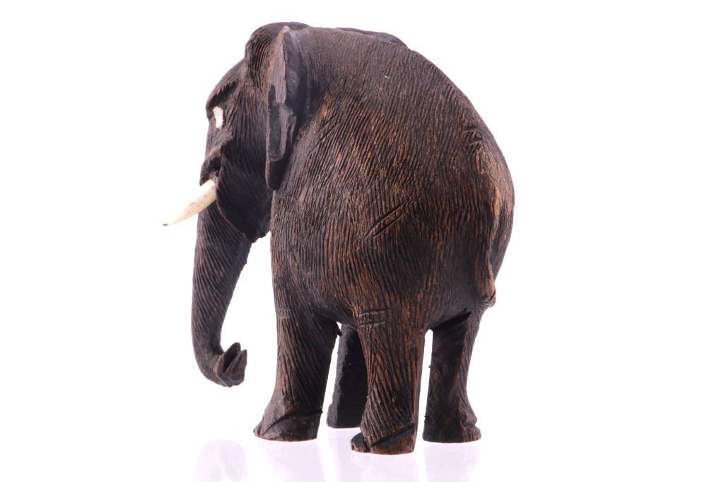 Featured in this lot is this collection of South African Leadwood elephant carvings. There are three carvings and two knobs in this collection. The hand carved elephant statues show wonderful craftsmanship, with warthog tusk tusks and lovely texturing to the skin of the elephants. The two knobs show hand carved construction with warthog tusk tusks and a hand crafted Leadwood dowel shown in the rear of the knob. The condition of these Leadwood elephants is good overall, with the medium size elephant missing one of the warthog tusks. The measurements of this collection of elephant figures range from 3 1/4" x 3 1/2" x 1 1/2" to 4 1/2" x 6 1/2" x 2 1/4".