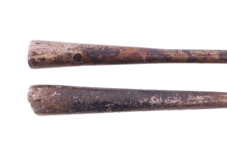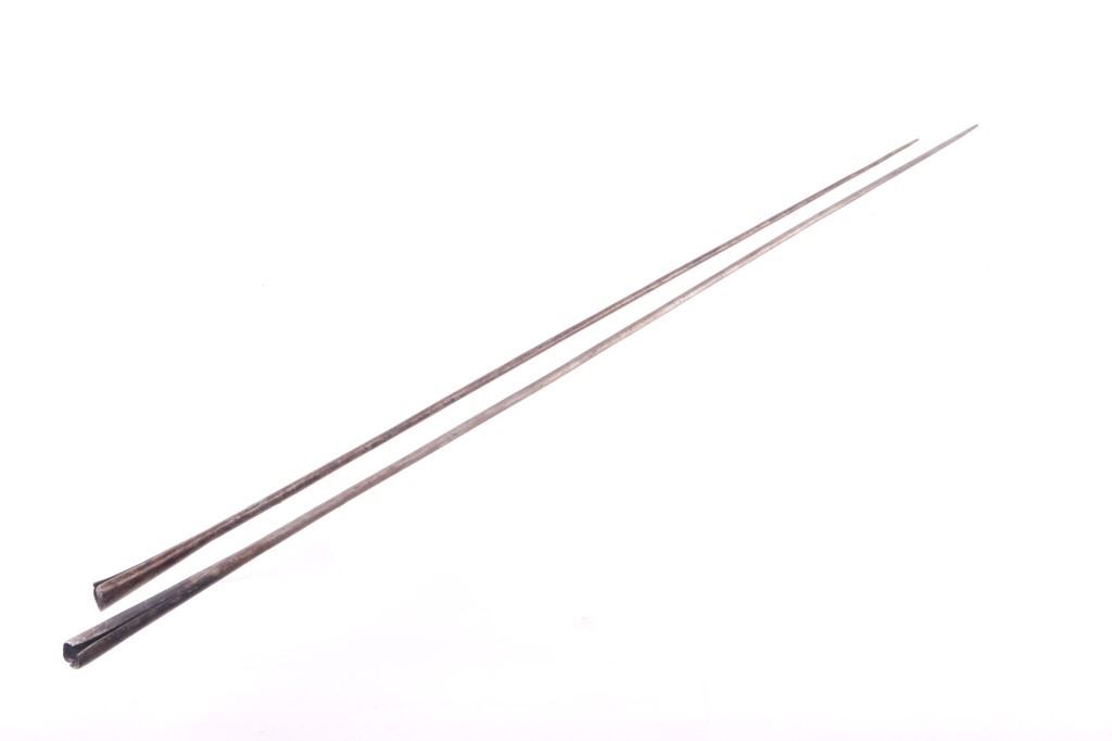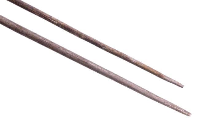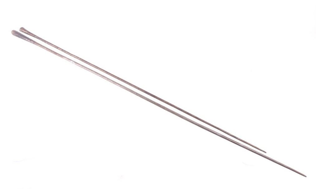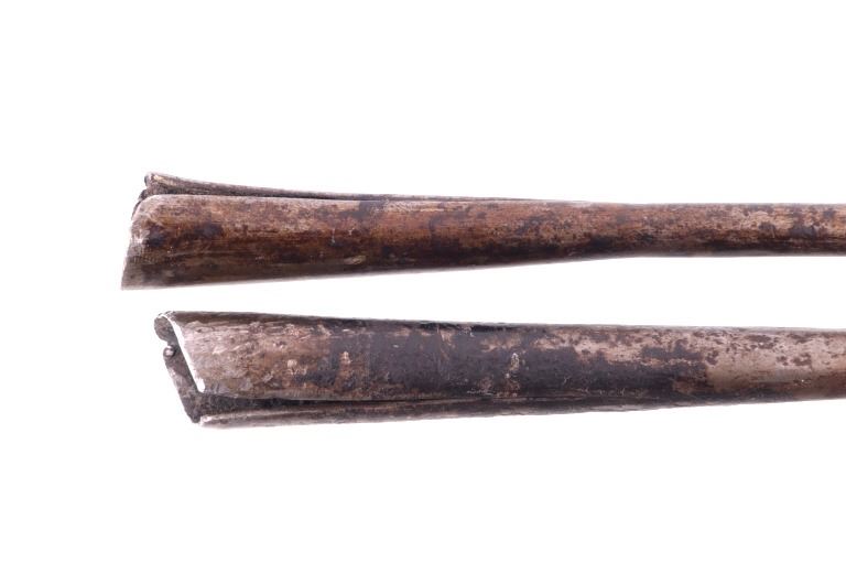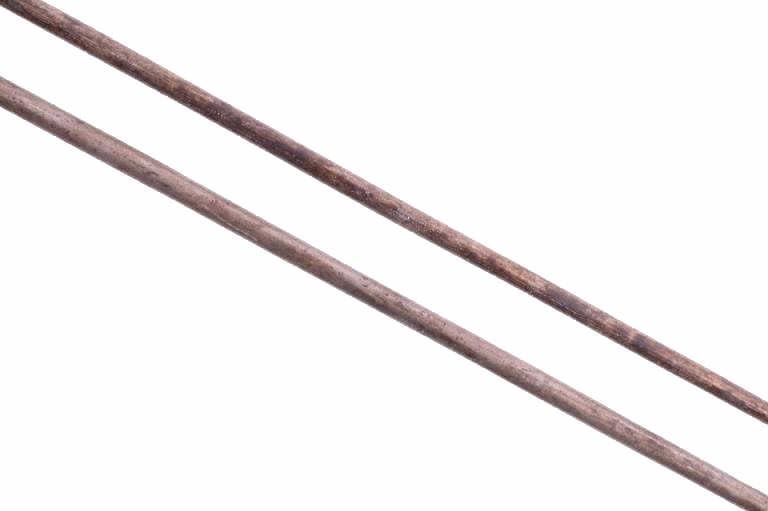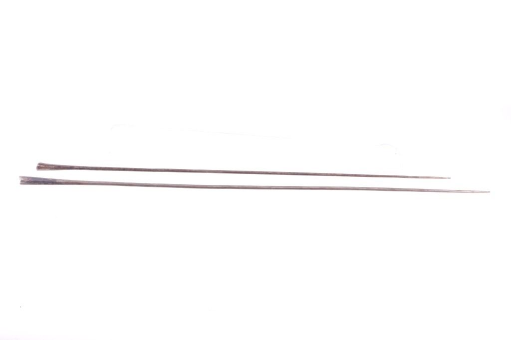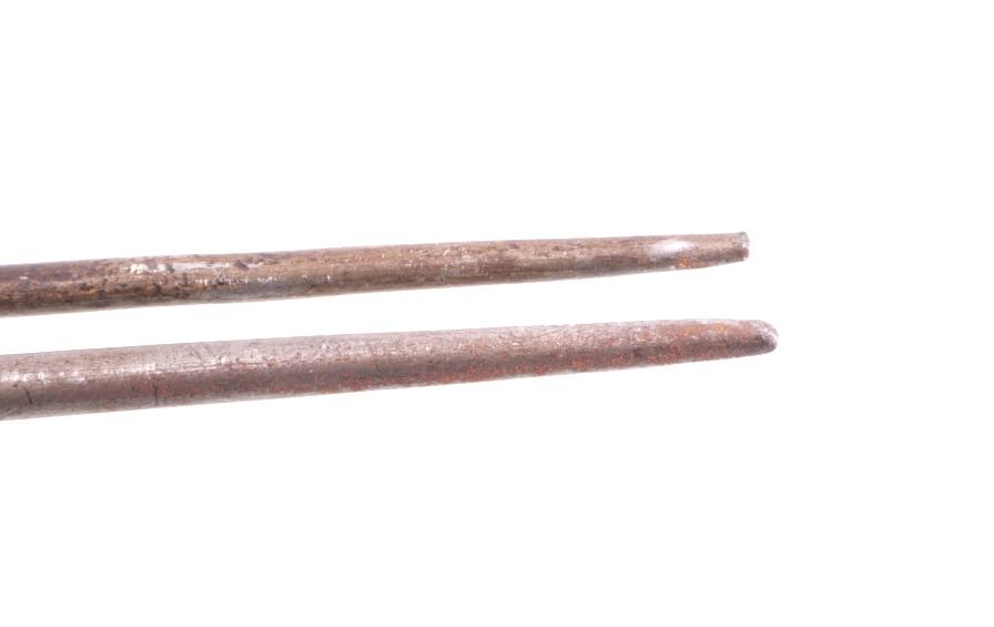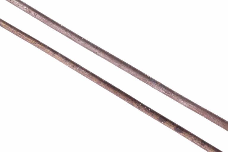 Featured in this lot is this South African needle point spear points, circa 1930's. There are two points in this collection featuring needle spear points with rolled spear haft connector. The condition of these spear points is good, with oxidation consistent with the age of the spear points. The measurements of these spear points are 32 3/4" x 3/4" x 3/4" and 36 1/4" x 3/4" x 3/4".
