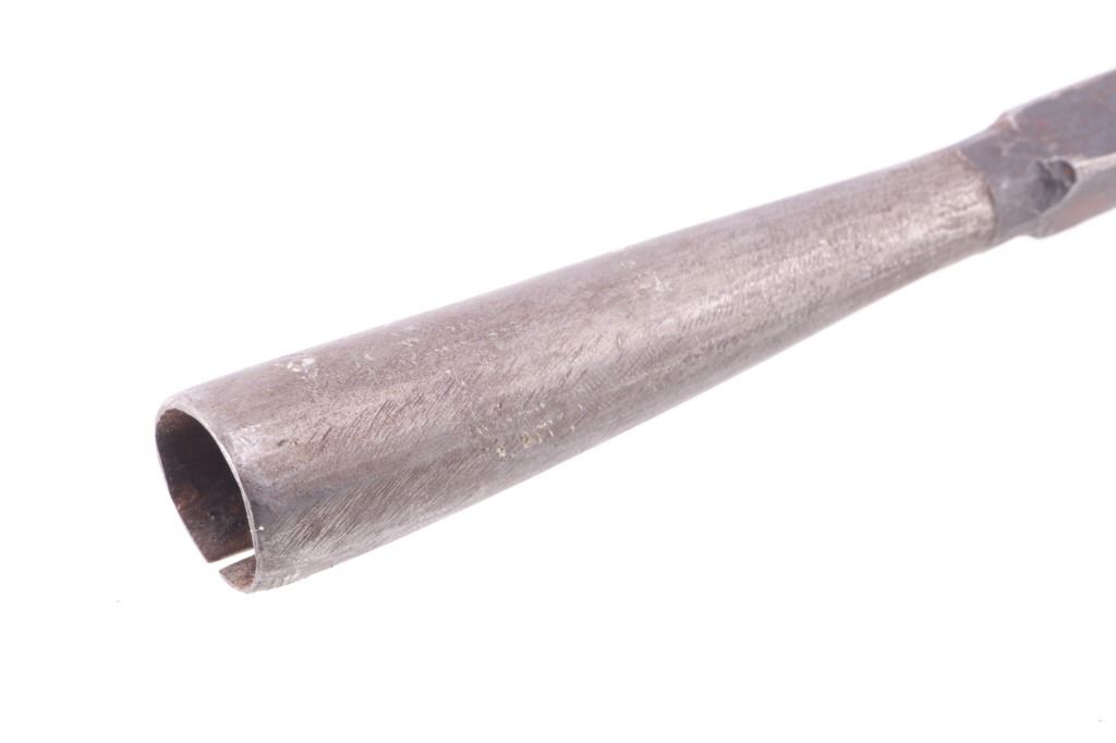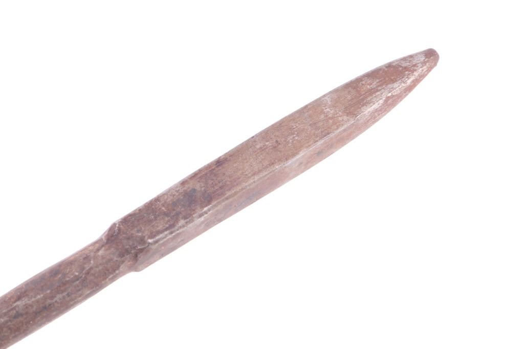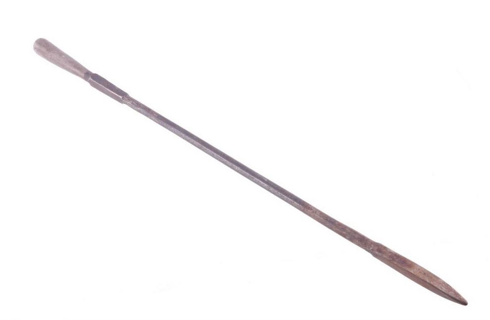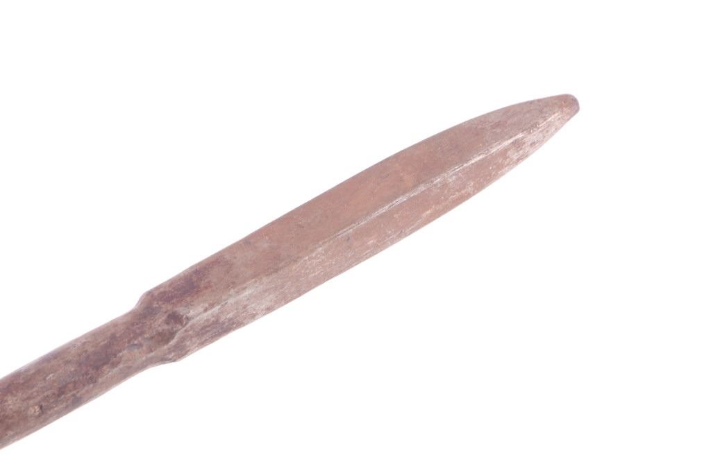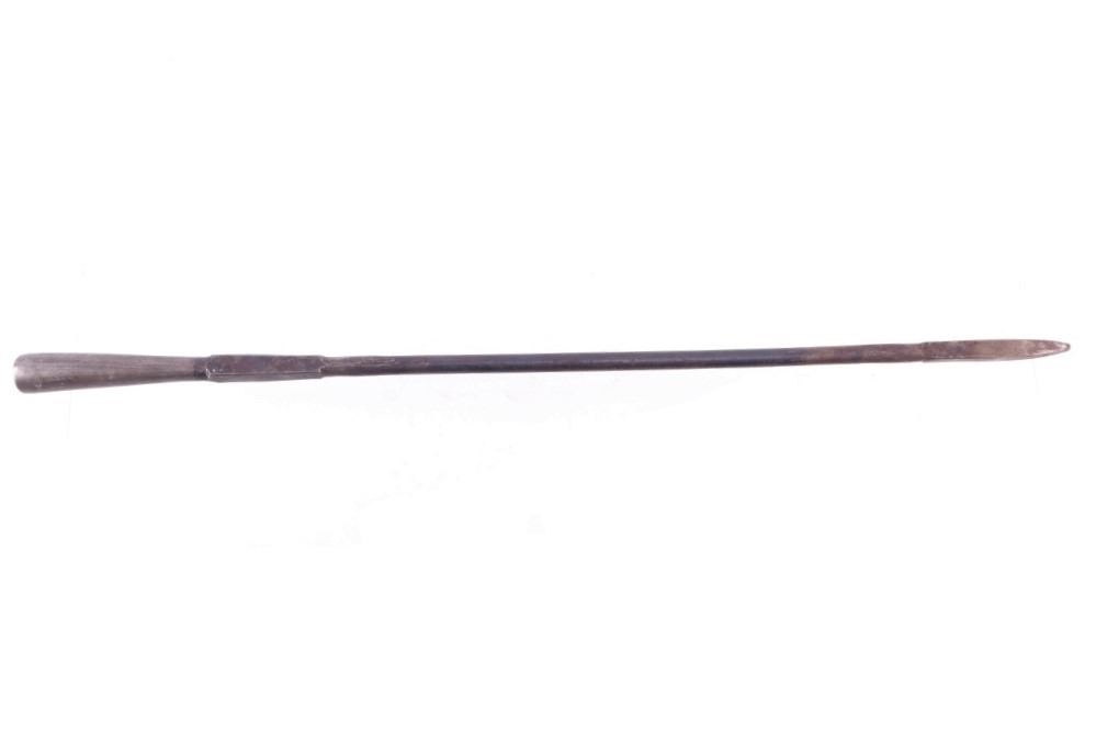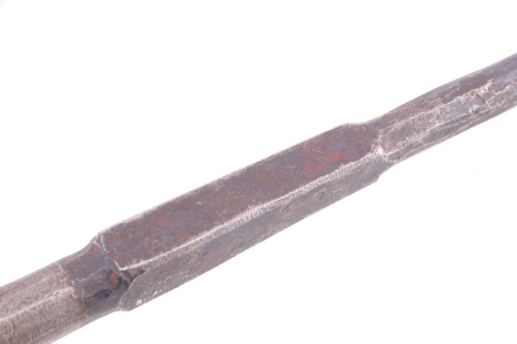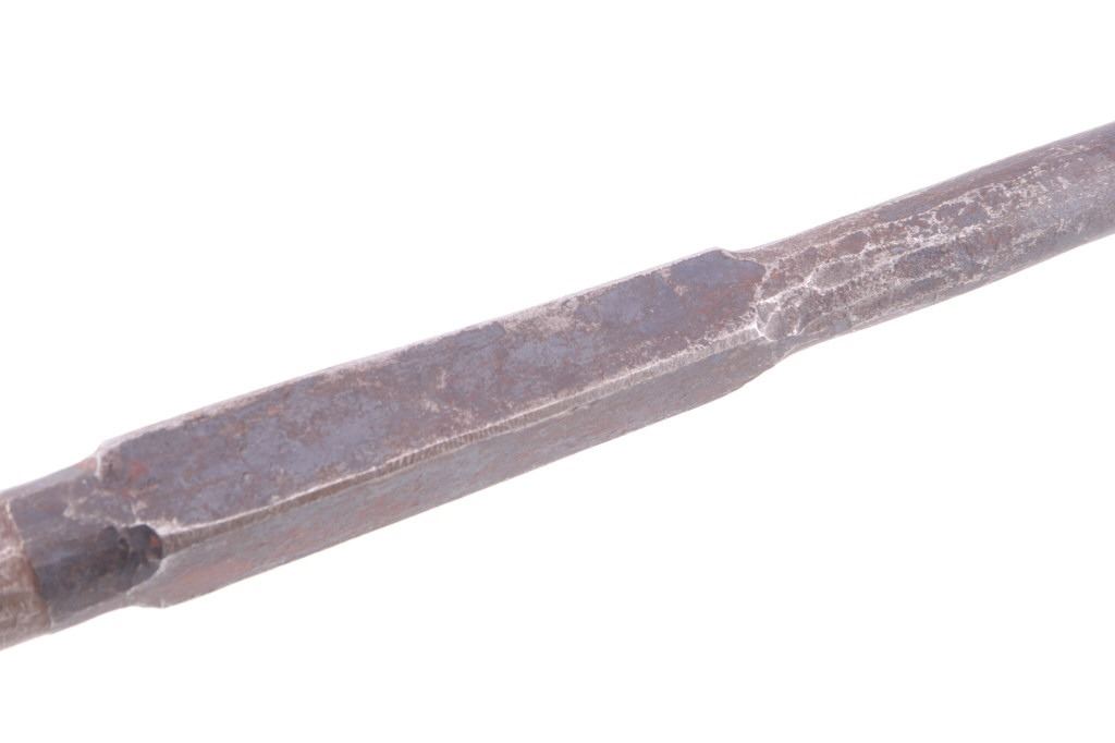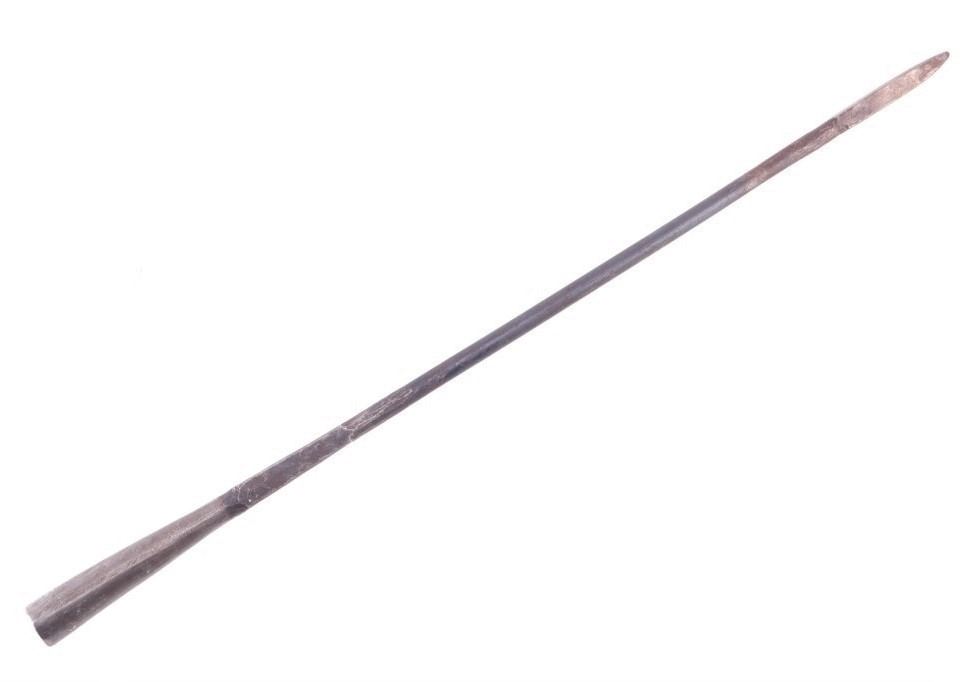 Featured in this lot is this South African square tip pilum, circa 1930's. The spear point shows a wonderfully constructed, heavy South African pilum with a long thick shaft and square body tip. The condition of this spear point is good, with no obvious signs of damage. The measurements of this spear point are 27" x 1" x 1".