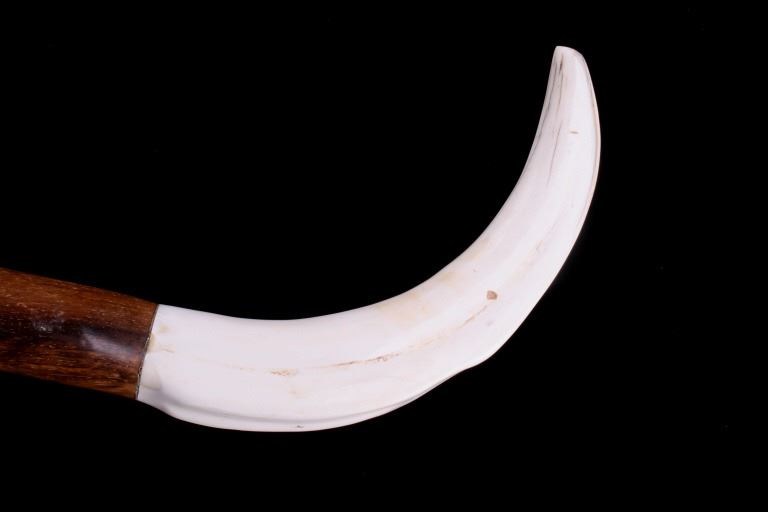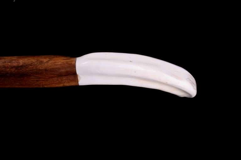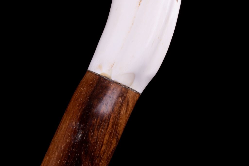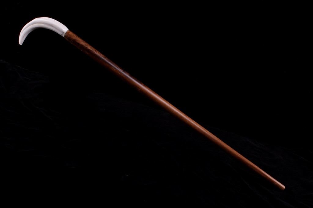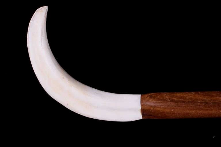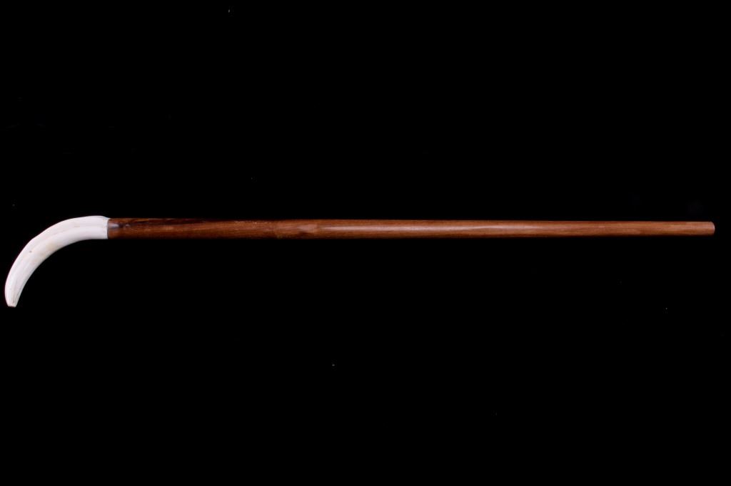 Featured in this lot is this South African warthog tusk cane, circa 1930's. The cane shows wonderful construction with a fire hardened hardwood shaft and a polished warthog tusk handle. The condition of this of cane is good, with no obvious signs of damage. The measurements of this cane are 39 1/2" x 5 1/2" x 1".