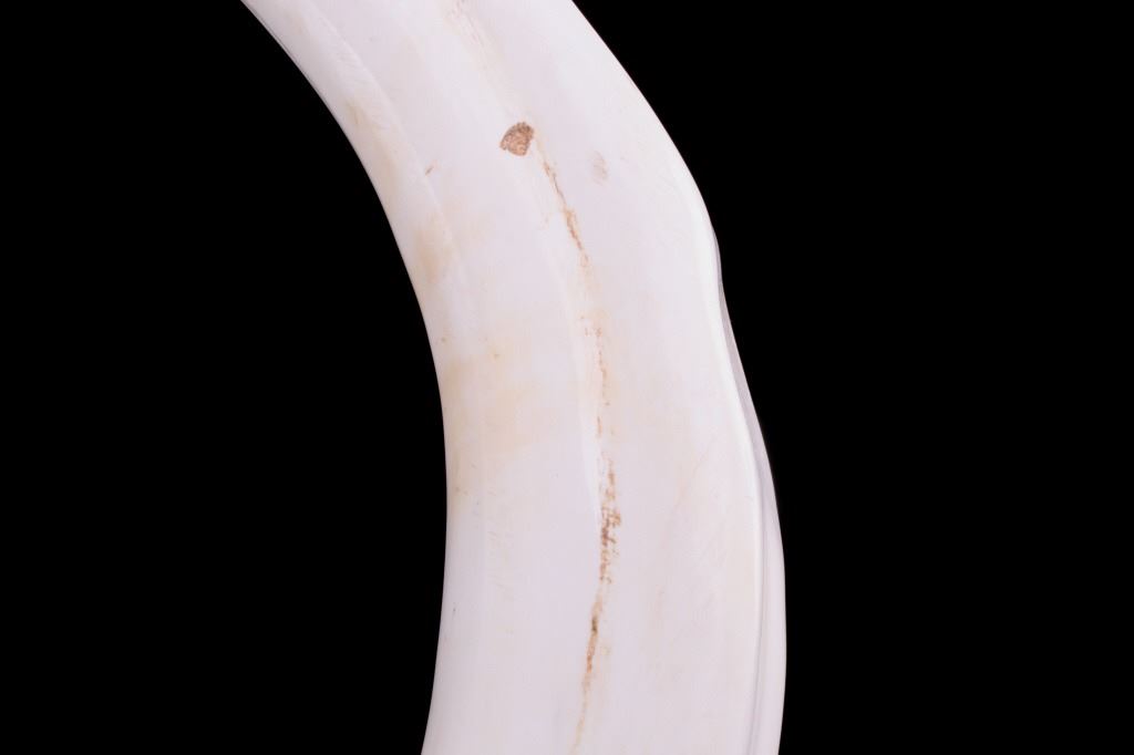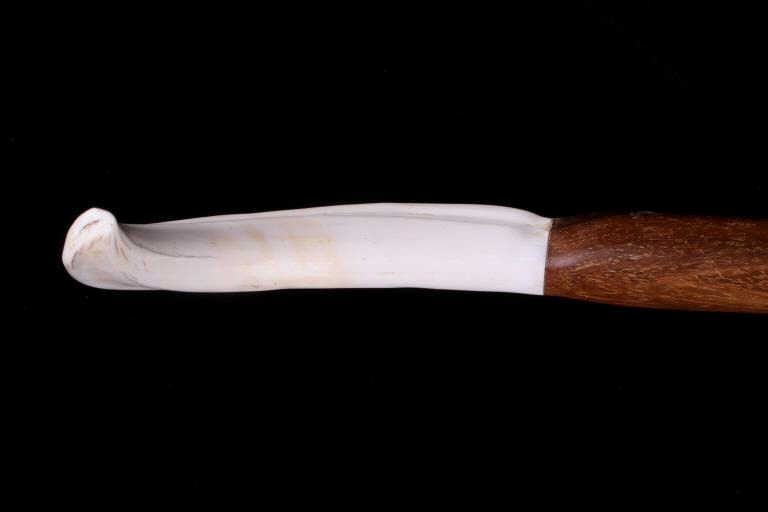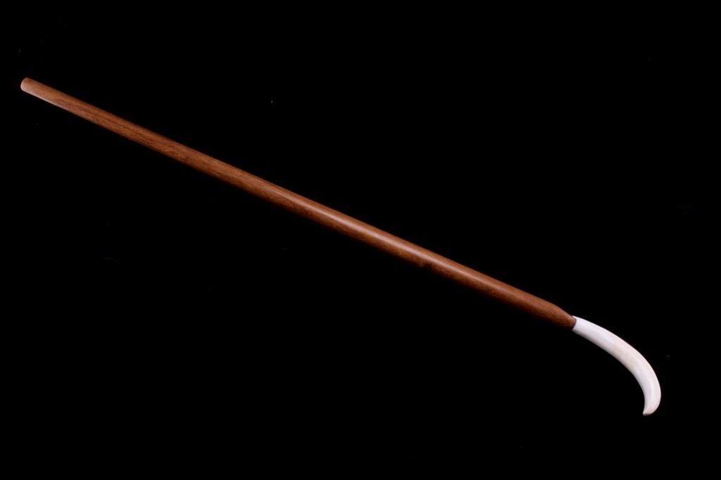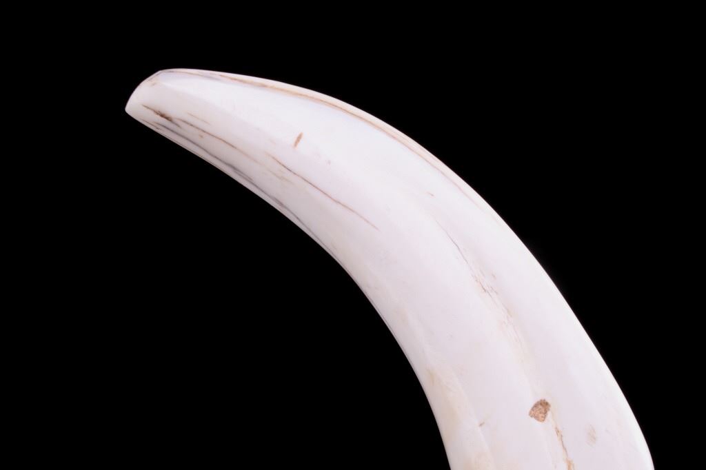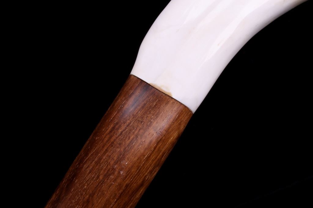 Featured in this lot is this South African warthog tusk cane, circa 1930's. The cane shows wonderful construction with a fire hardened hardwood shaft and a polished warthog tusk handle. The condition of this of cane is good, with no obvious signs of damage. The measurements of this cane are 39 1/2" x 5 1/2" x 1".