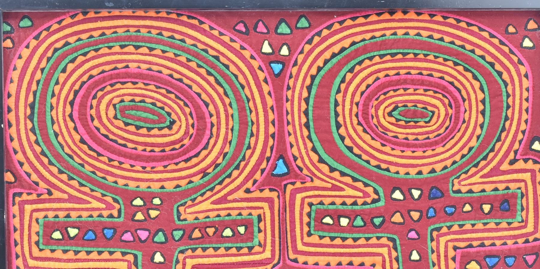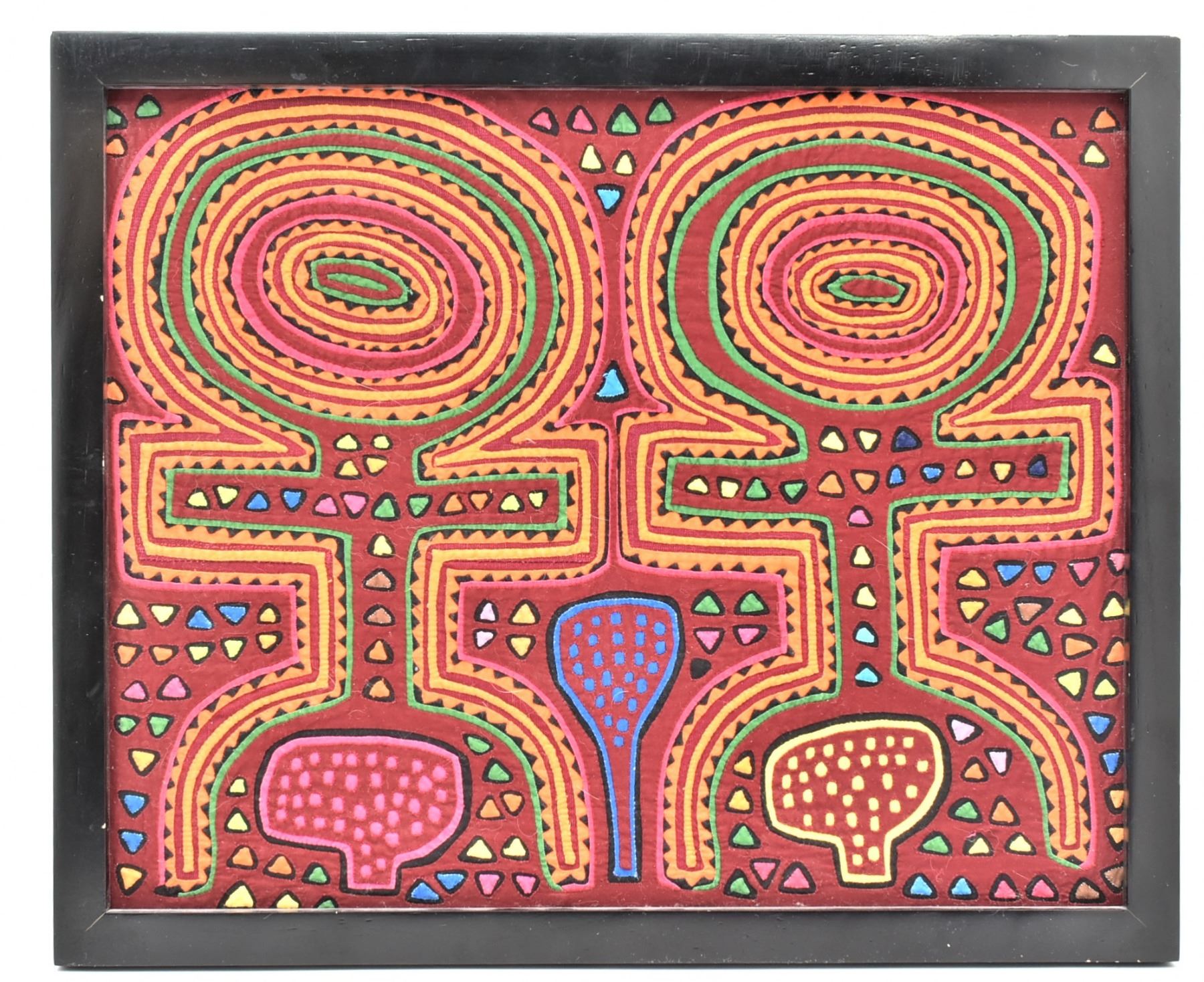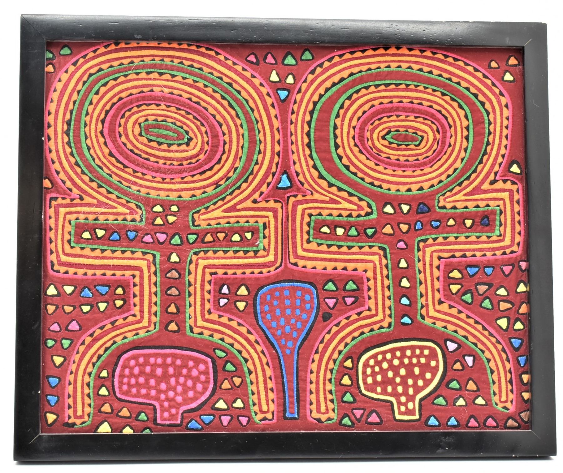 South American Alien Mola Textile, framed, measures 16.5'' x 14'', FYI: ''The Mola or Molas is a hand-made textile that forms part of the traditional women's clothing of the indigenous Guna people from Panamá and Colombia, South America.''