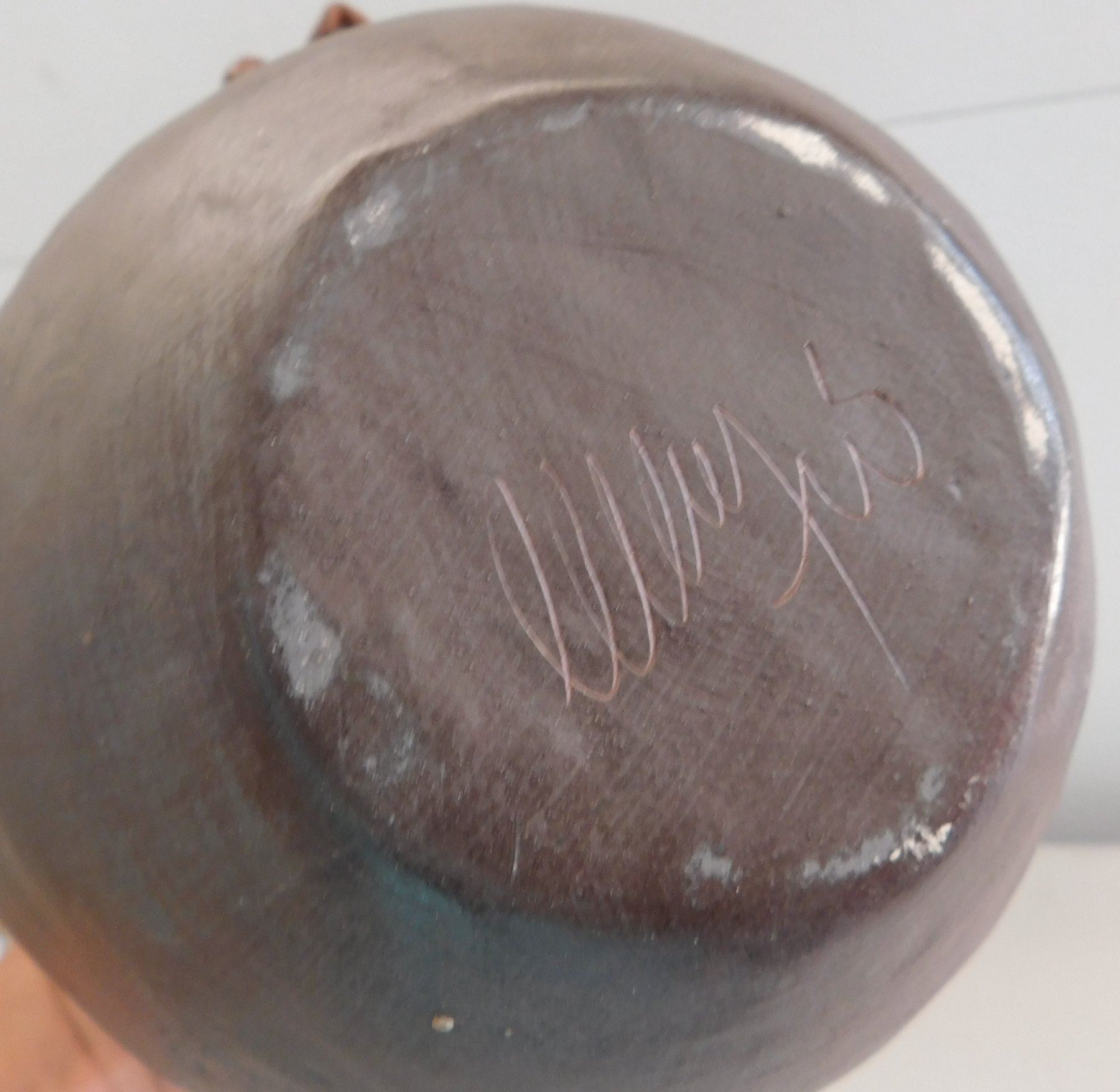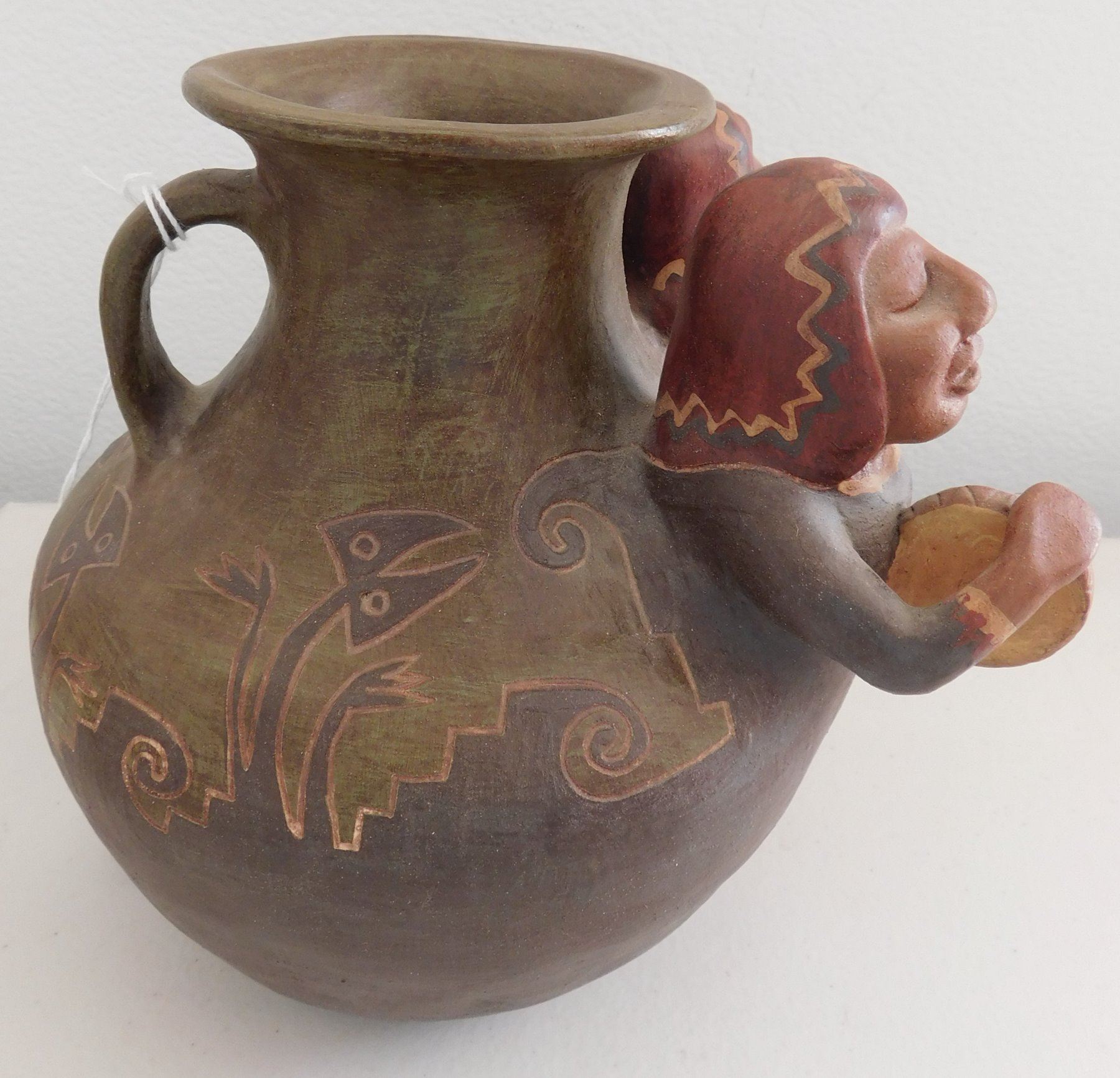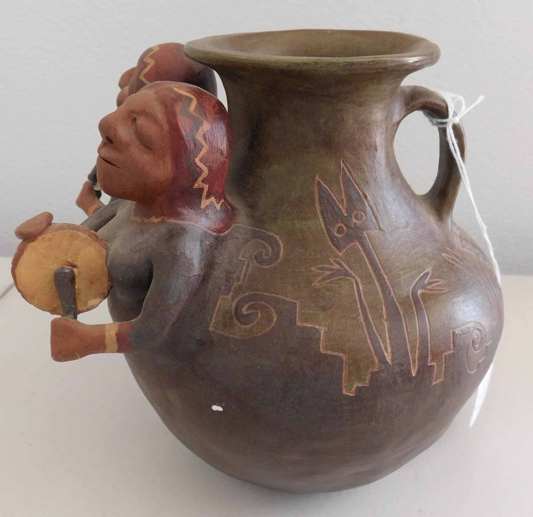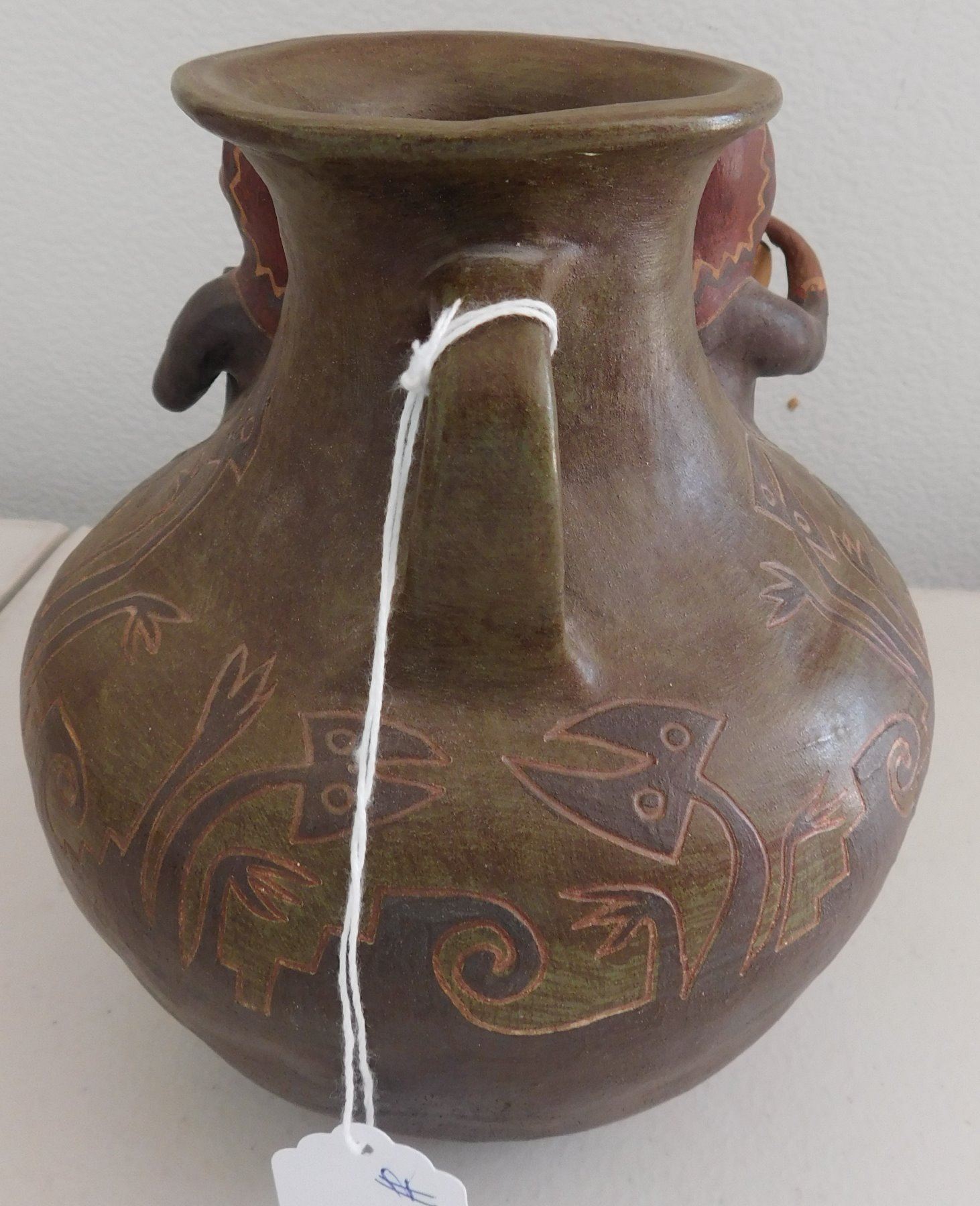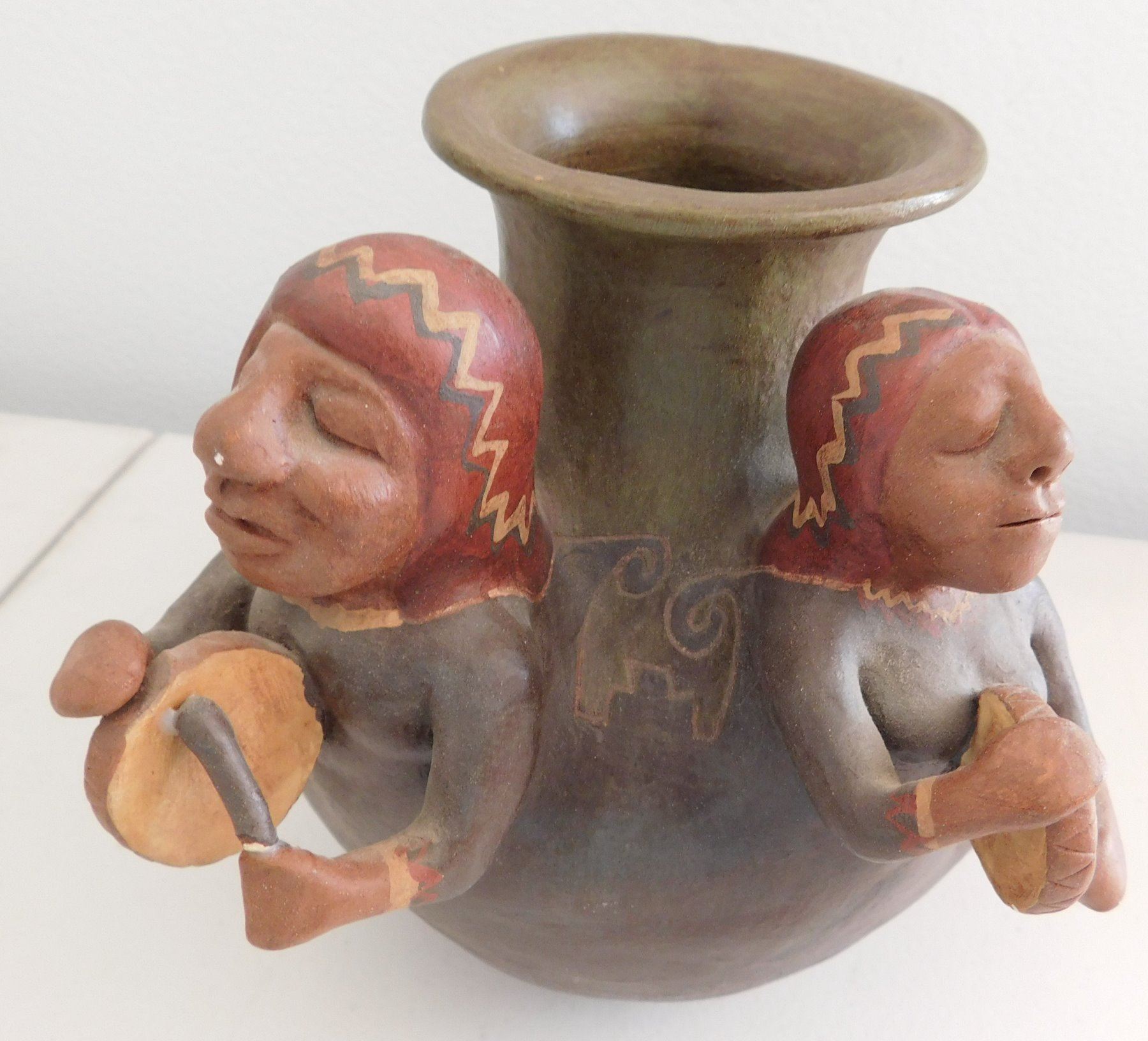 South American Double Effigy Pot, c. 1970s. Made of clay and paint, the item measures 7.5" x 6.5" x 7.5". South America. Extra carving on pot, fine detail to effigy figures. Signed on bottom. Condition: Very good, see images. Shipping: $32.50 w/insurance and signature, double-boxed.