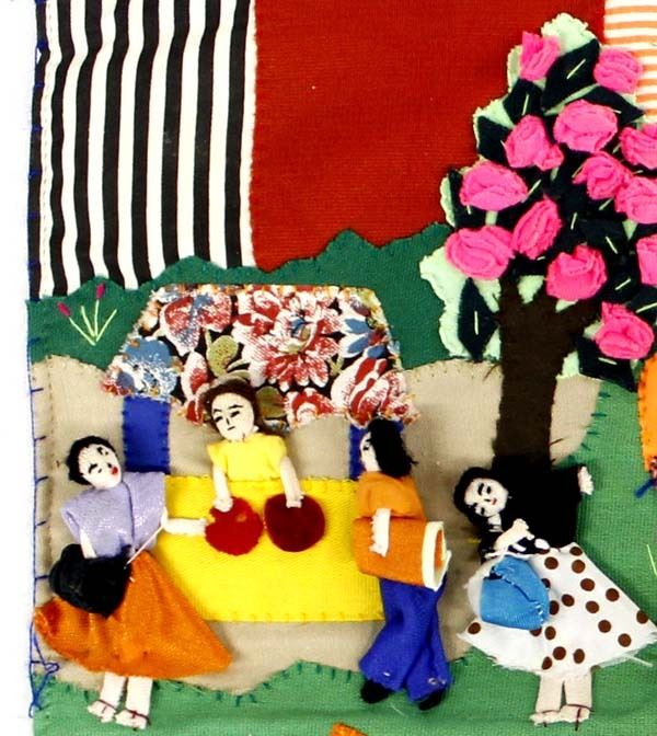 South American Peruvian Park Scene Arpillera, measures 18.5'' x 19'', hand sewn