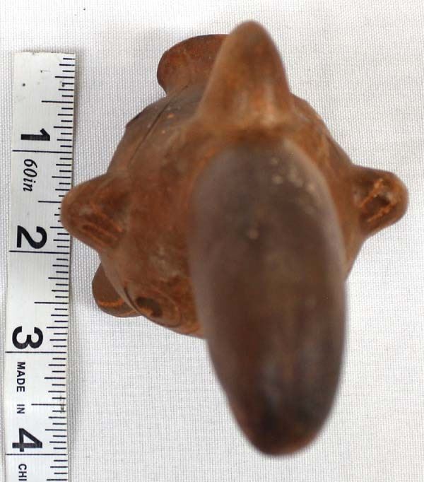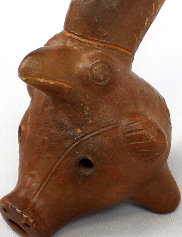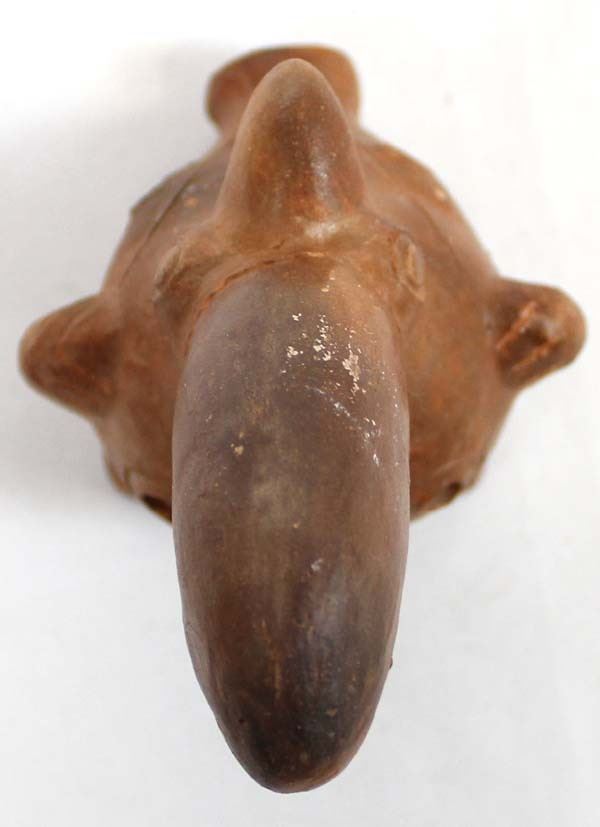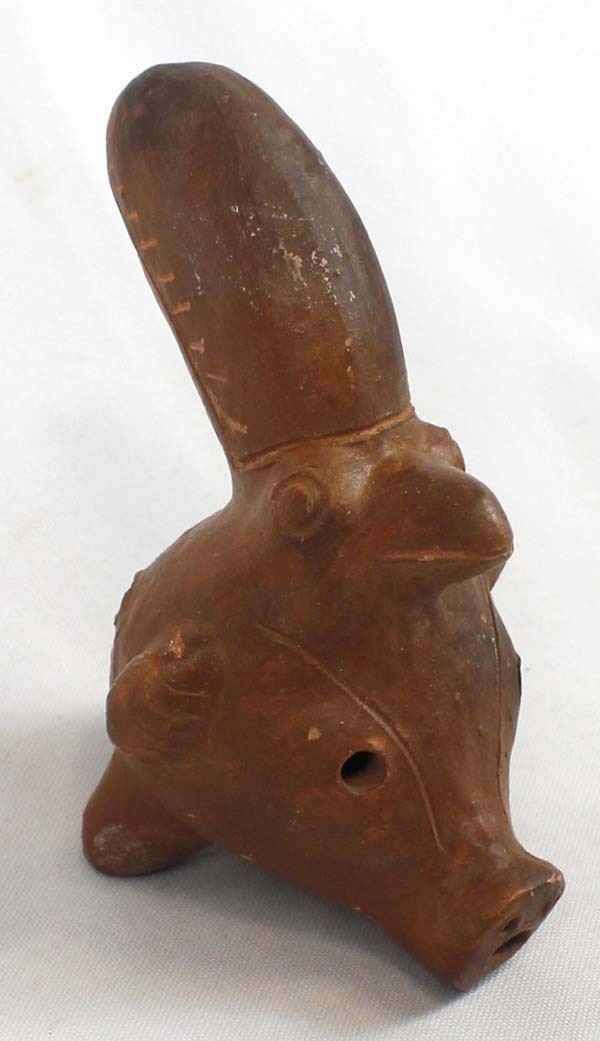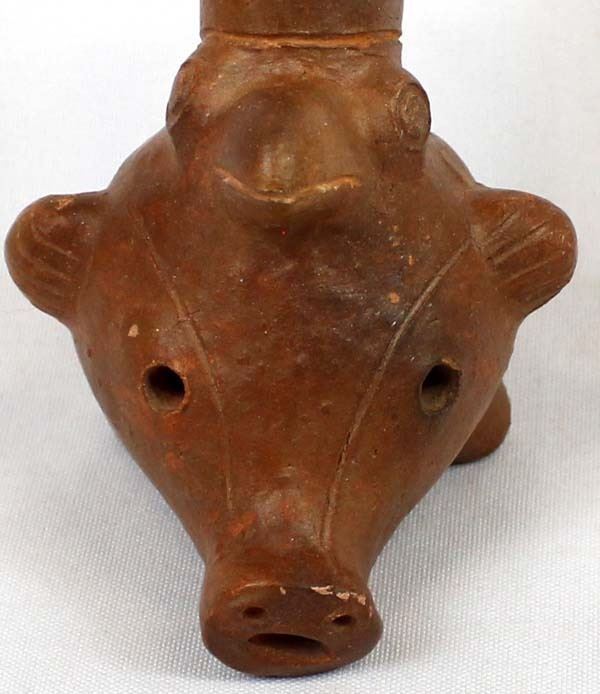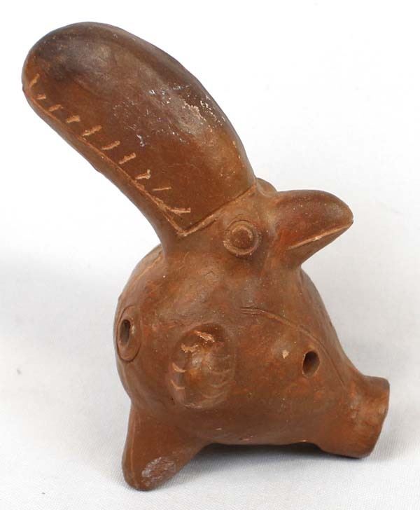 South American Pottery Flute of Many Animals. They included are 2 birds a pig a dog and a Couger plus others. This unique item is 6'' long.