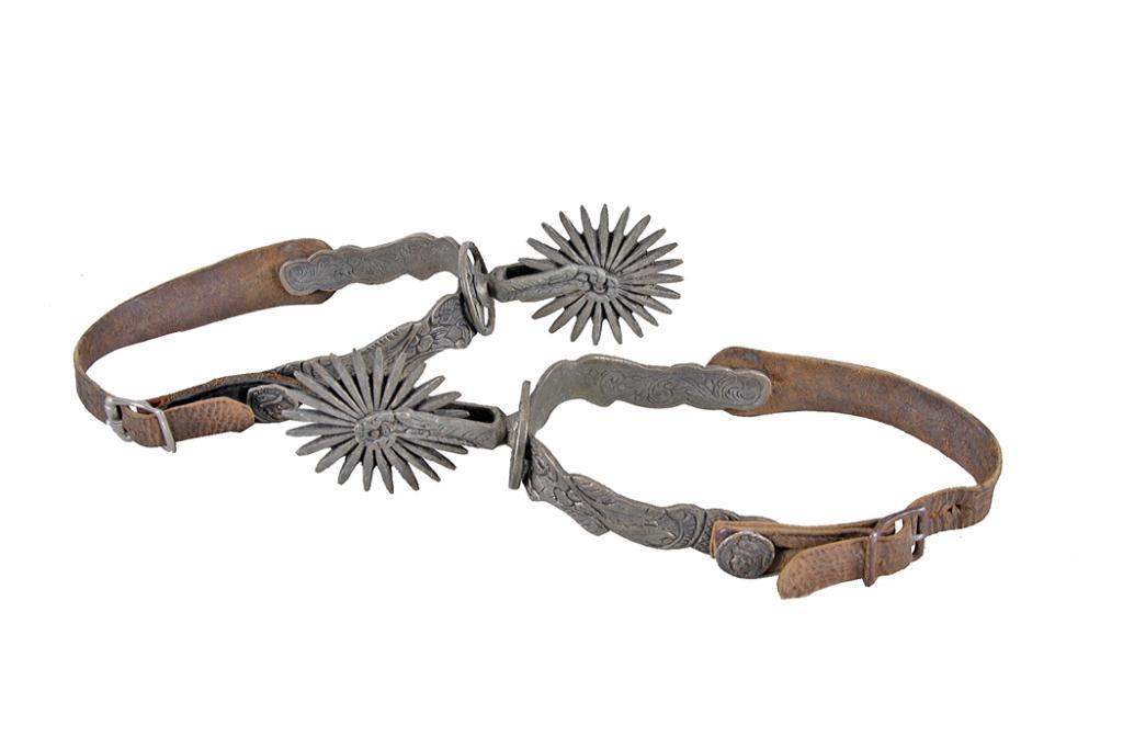 South American Pressed Patterned Spurs Large rowels and good leather, cast low grade nickel, from Ar