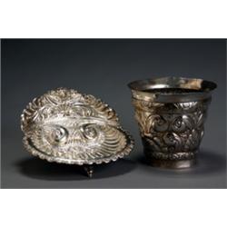 South American Silver Shell-Form Bowl and a JardiniFre, Mid-20th Century, The bowl raised on...