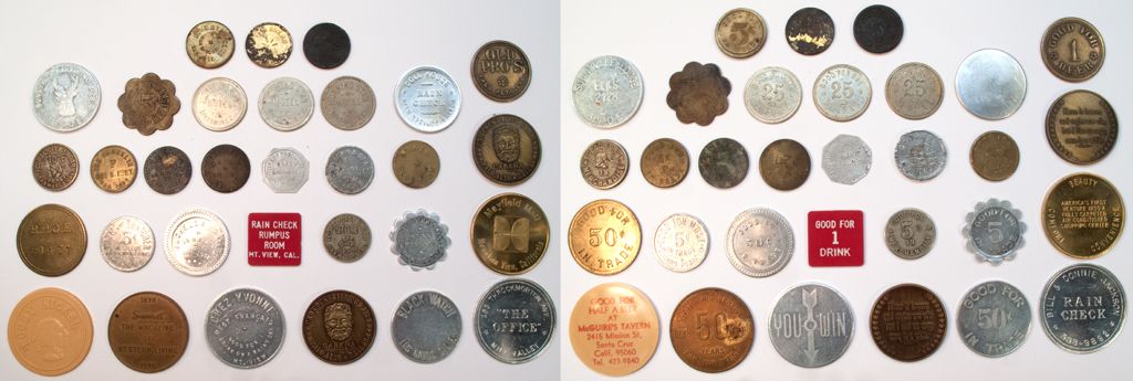 Assorted tokens from South Bay areaa of Northern California. Daly city, Mill Valley, Mountain View, San Mateo, San Jose, Palo Alto, Livermore, Santa Cruz, Sunnyvale, Los Gatos,