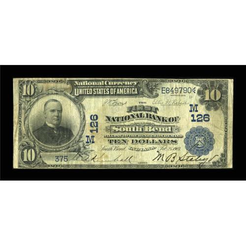 <B>South Bend, IN</B></I> - $10 1902 Date Back Fr. 616 <B>The First NB</B></I> Ch. # (M)126<BR> Bold signatures of Kimball and Staley are noted on this moderately circulated issue.<BR><BR><b>Shipping:</b> Coins & Currency (<a target="_blank" href="http://www.heritageauctions.com/common/shipping.php">view shipping information</a>)