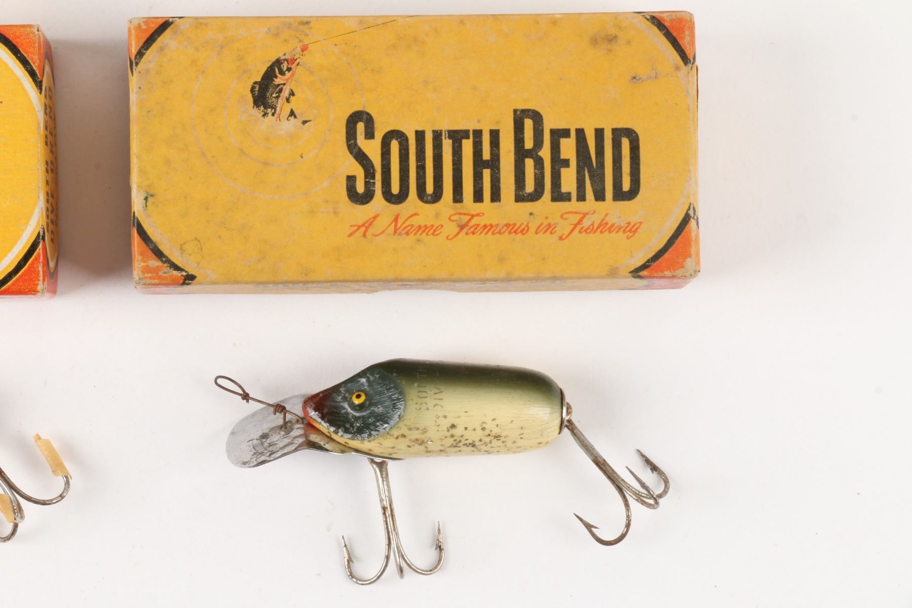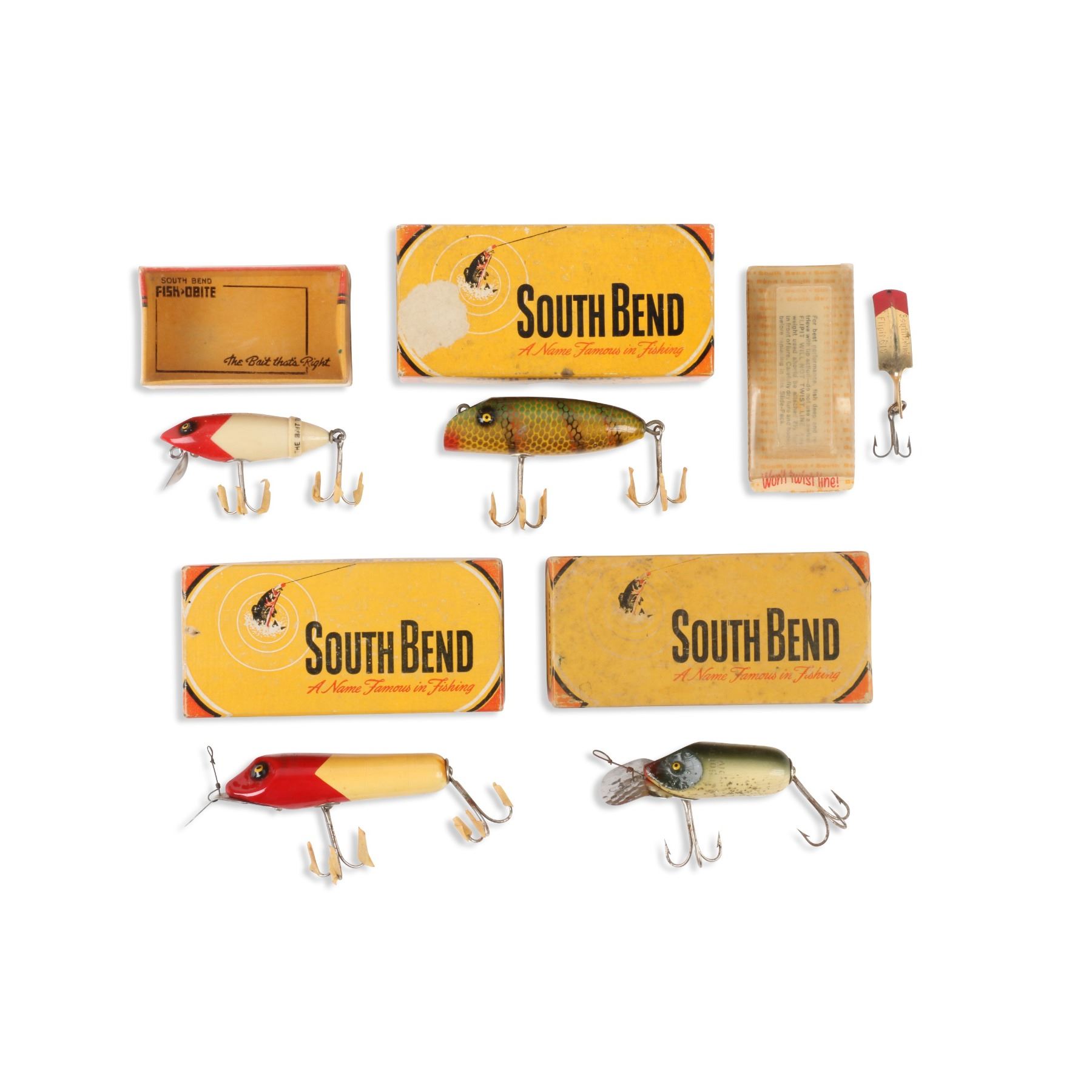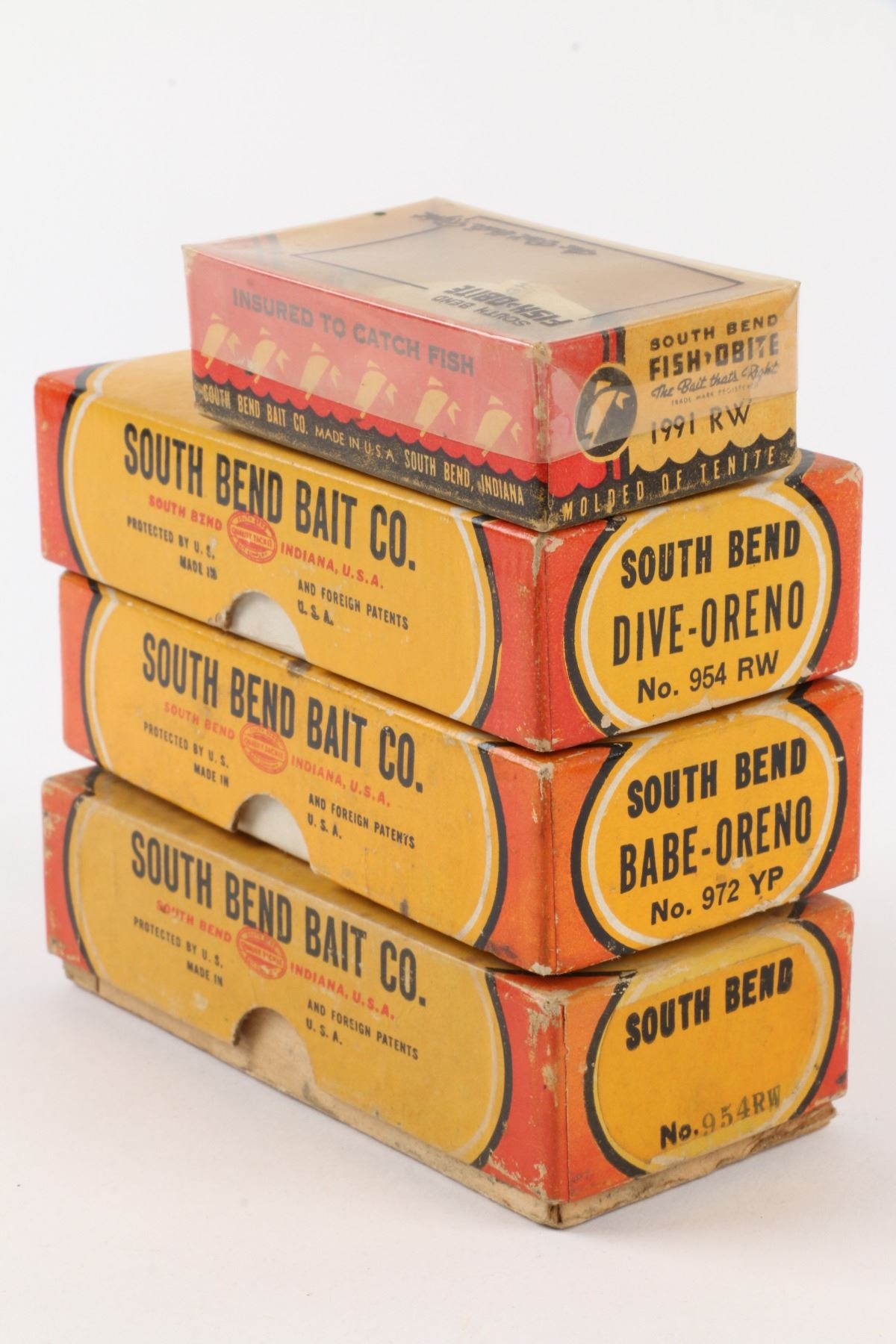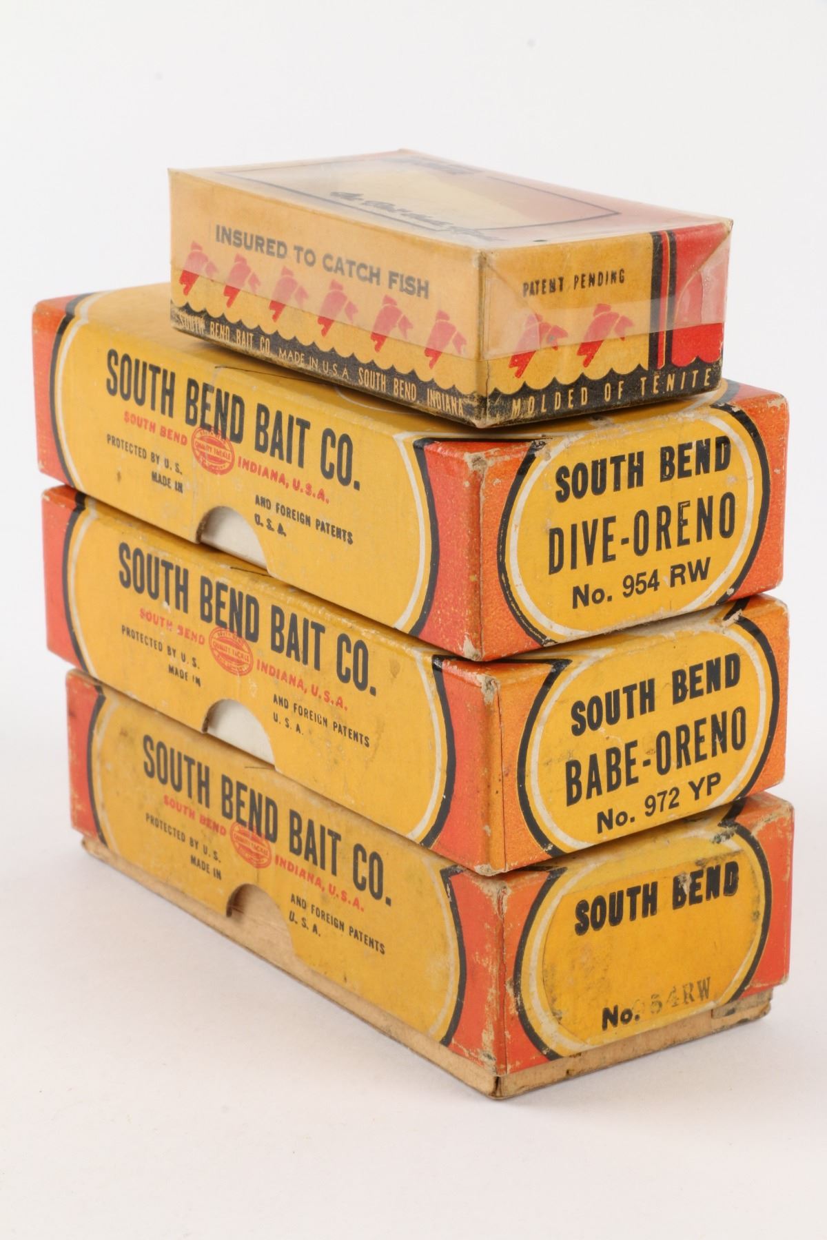 South Bend Bait Company, United States. Boxed. Material: Mixed. Quantity: 5. Grade: VG. 3" - 4.5" boxes. Est. $100-125.