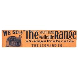 South Bend Malleable Range sign, The Leonard Co., c.1910, VG condition, 29.5"W x 9"H.
