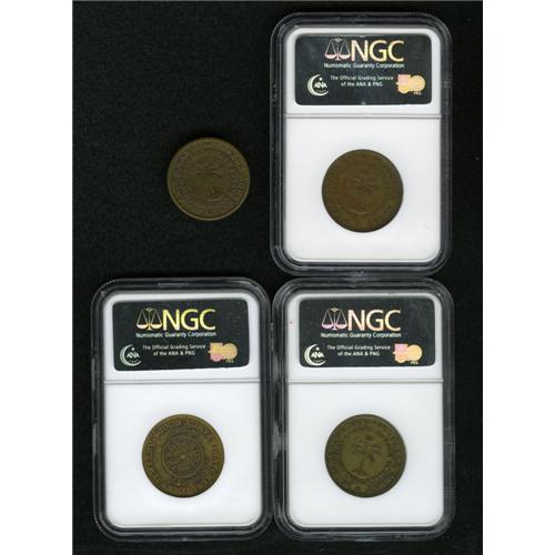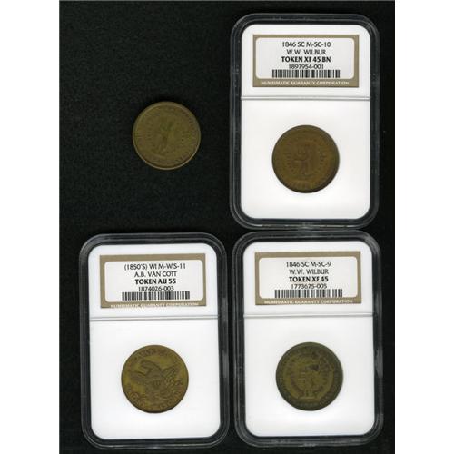 <B>South Carolina 1846 SC M-SC-9, W.W. Wilbur, Charleston, XF45 NGC,</B></I> two pieces, one has a problematic obverse while the other has pleasing reddish-brown surfaces; <B>South Carolina 1846 SC M-SC-9, W.W. Wilbur XF45 Uncertified, VF30 Obverse Scratches,</B></I> light color; and a <B>Wisconsin (1850s) WI M-WIS-11, A.B. Van Cott, Racine, AU55 NGC,</B></I> sharply struck with light surfaces.<BR><I>From The Troy Wiseman Collection.</B></I>