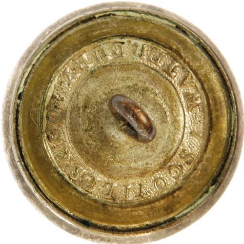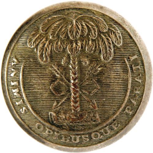 <B>South Carolina Confederate Civil War Button.</B></I> Listed as Albert SC 13-A1, this button measures 23mm and has its original stand up eye intact. The verso clearly shows the maker's name, "Scovills & Co: Waterbury". The front shows the Palmetto tree of South Carolina and all the other facets of the state seal; the arrows extend to the end of the logs; clearly identifying it in Albert. The Latin slogan is clear and clean, "<I>Animis Opibusque Parati</B></I>". This button is undug and thus very clean and shows little wear; only a slight amount of the original finish is worn away on the verso.