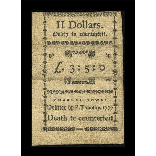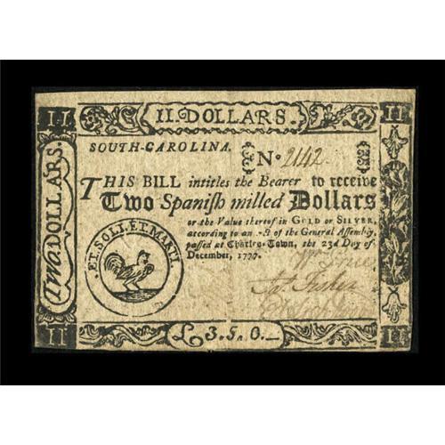 <B>South Carolina December 23, 1776 $2 Extremely Fine.</B></I> This is the rooster variety with the printed date of September 23, 1777 that has been pen corrected to 1776. The margins on three sides are quite close and there is a generous top margin. Much more available as a remainder than as a fully signed and issued note.<BR><BR><b>Shipping:</b> Coins & Currency (<a target="_blank" href="http://www.heritageauctions.com/common/shipping.php">view shipping information</a>)