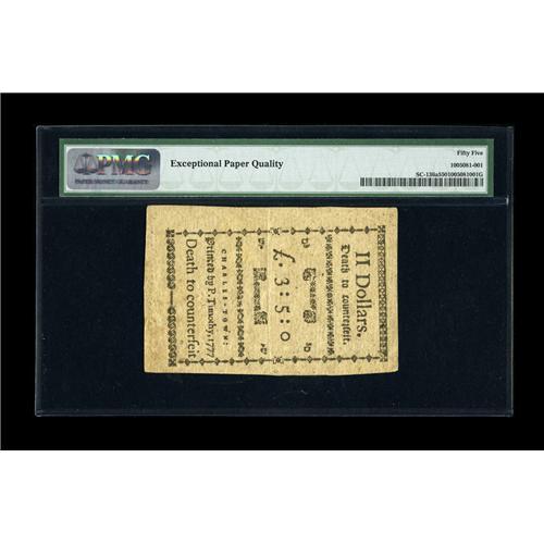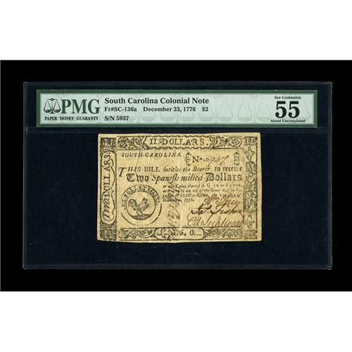 <B>South Carolina December 23, 1776 $2 PMG About Uncirculated 55 EPQ.</B></I> A hard centerfold is found on this well margined and, most importantly, fully signed example. Fully signed notes are much scarcer than their remainder counterparts and this note has four signatures and serial number. A note which is not often encountered in New condition, this should be a real prize for one lucky collector.<BR><BR><b>Shipping:</b> Coin/Currency (<a target="_blank" href="http://www.heritageauctions.com/common/shipping.php">view shipping information</a>)
