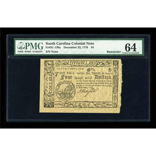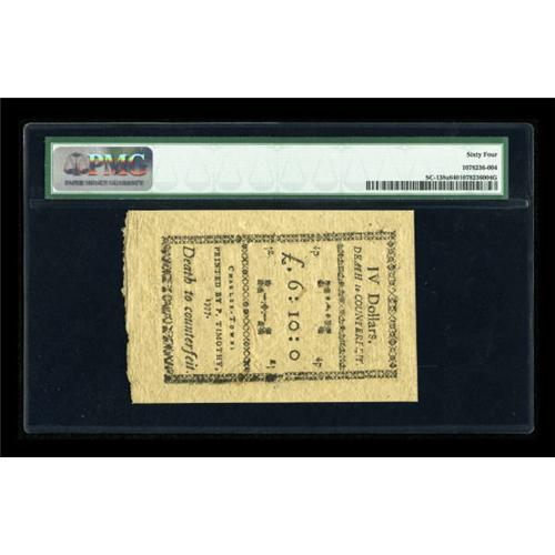 <B>South Carolina December 23, 1776 $4 PMG Choice Uncirculated 64.</B></I> Hebrew characters on the back of this note were used as an anticounterfeiting device. There is a very minor as-made weakness in the paper at bottom center. <BR><BR><b>Shipping:</b> Coins & Currency (<a target="_blank" href="http://www.heritageauctions.com/common/shipping.php">view shipping information</a>)