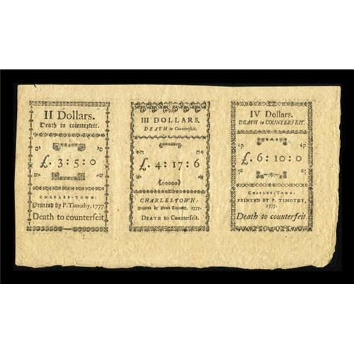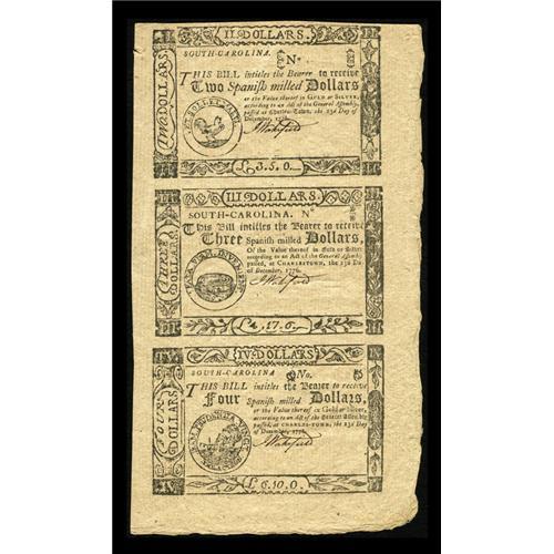 <B>South Carolina December 23, 1776 Uncut Vertical Strip of Three $2, $3, $4 New.</B></I> This is only the third multiple that we have handled of this issue. These are remainder notes, signed only by Wakefield, and lacking serial numbers. The bottom and right margins go all the way out to the deckled edge of the sheet. A petty left edge tear is noticed and there is a lateral center bend. This is a great item from this colony's challenging issues. <BR><BR><b>Shipping:</b> Coins & Currency (<a target="_blank" href="http://www.heritageauctions.com/common/shipping.php">view shipping information</a>)