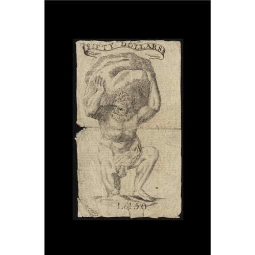 <B>South Carolina February 8, 1779 $50 Very Fine.</B></I> There is a small v-shaped piece missing at the top of the center fold and a few edge splits, but the signatures are strong and the appearance of this Coram-engraved note is considerably nicer than the description makes it sound.