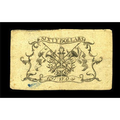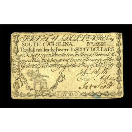 <B>South Carolina February 8, 1779 $60 Fine-Very Fine.</B></I> The top edge shows a few small tears while the right edge has an approximate quarter inch tear. A spot of blue ink is found near the bottom edge on both the face and back.<BR><BR><b>Shipping:</b> Coins & Currency (<a target="_blank" href="http://www.heritageauctions.com/common/shipping.php">view shipping information</a>)