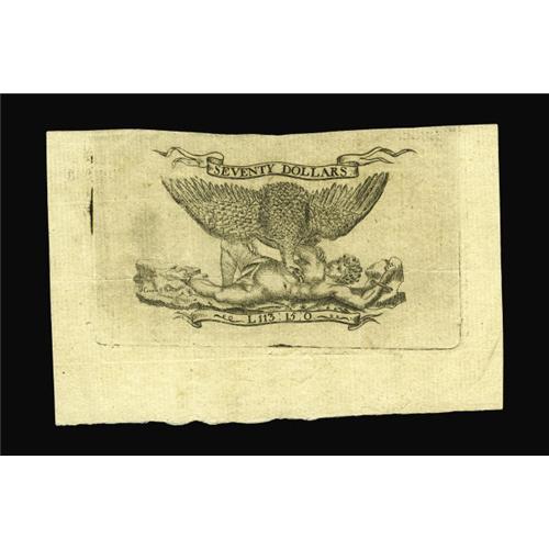 <B>South Carolina February 8, 1779 $70 Extremely Fine.</B></I> A hugely margined example of this extremely popular issue and denomination. The back vignette is signed by Coram, and it is a particularly boldly printed example of Prometheus bound and his feathered tormentor. We've handled technically higher grade pieces, but the huge margins, signatures, and eye appeal of this piece are astounding.