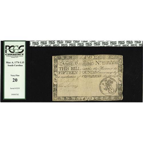 <B>South Carolina March 6, 1776 <$15 PCGS Very Fine 20.</B></I> A very pleasing example of this much scarcer March issue that is well printed and which seems a full grade higher from the face.<BR><I>From The Troy Wiseman Collection</B></I>
