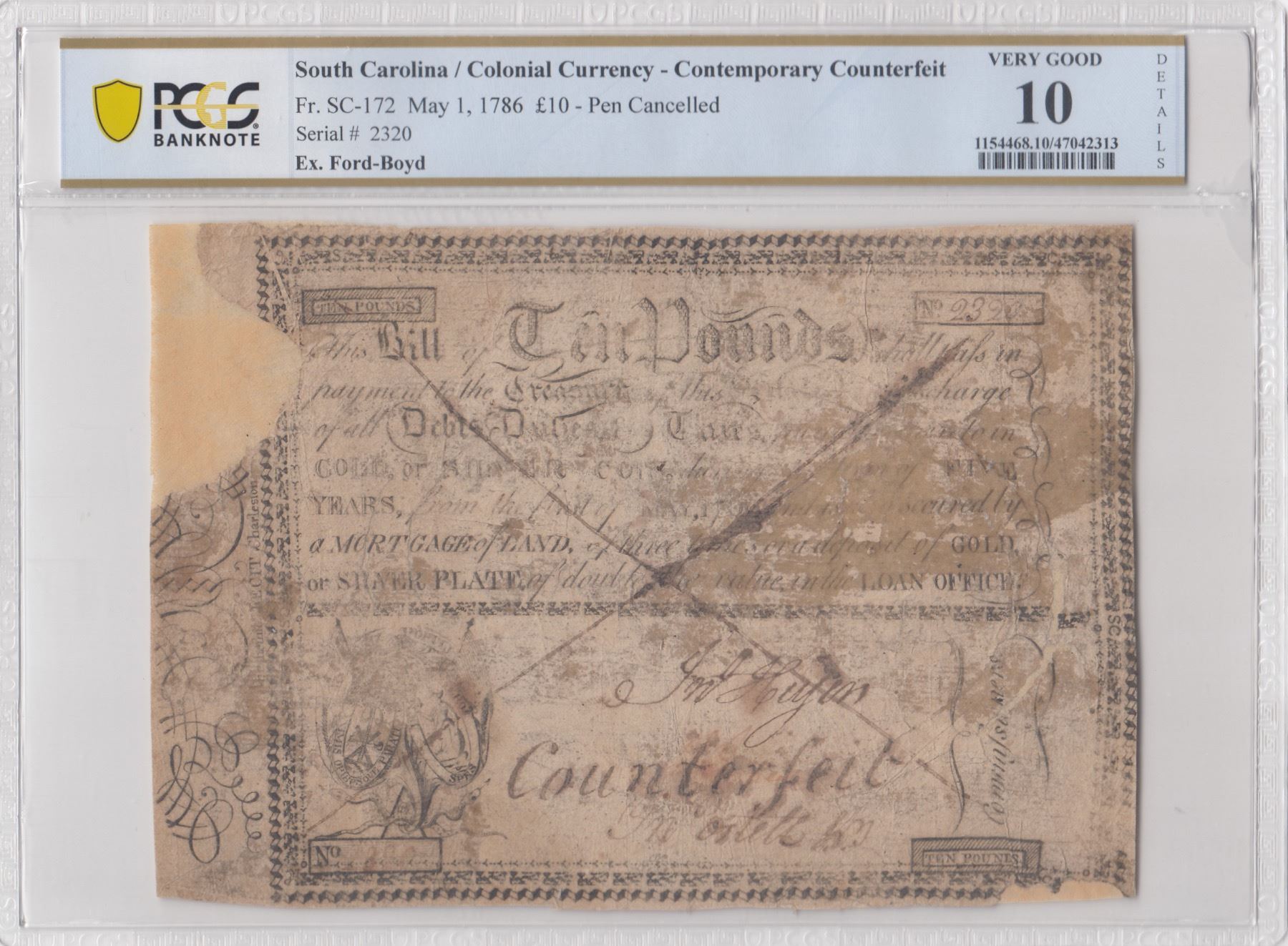 South Carolina. May 1, 1786. Contemporary Counterfeit Ten Pounds in Gold or Silver Coin. Fr. SC-172.